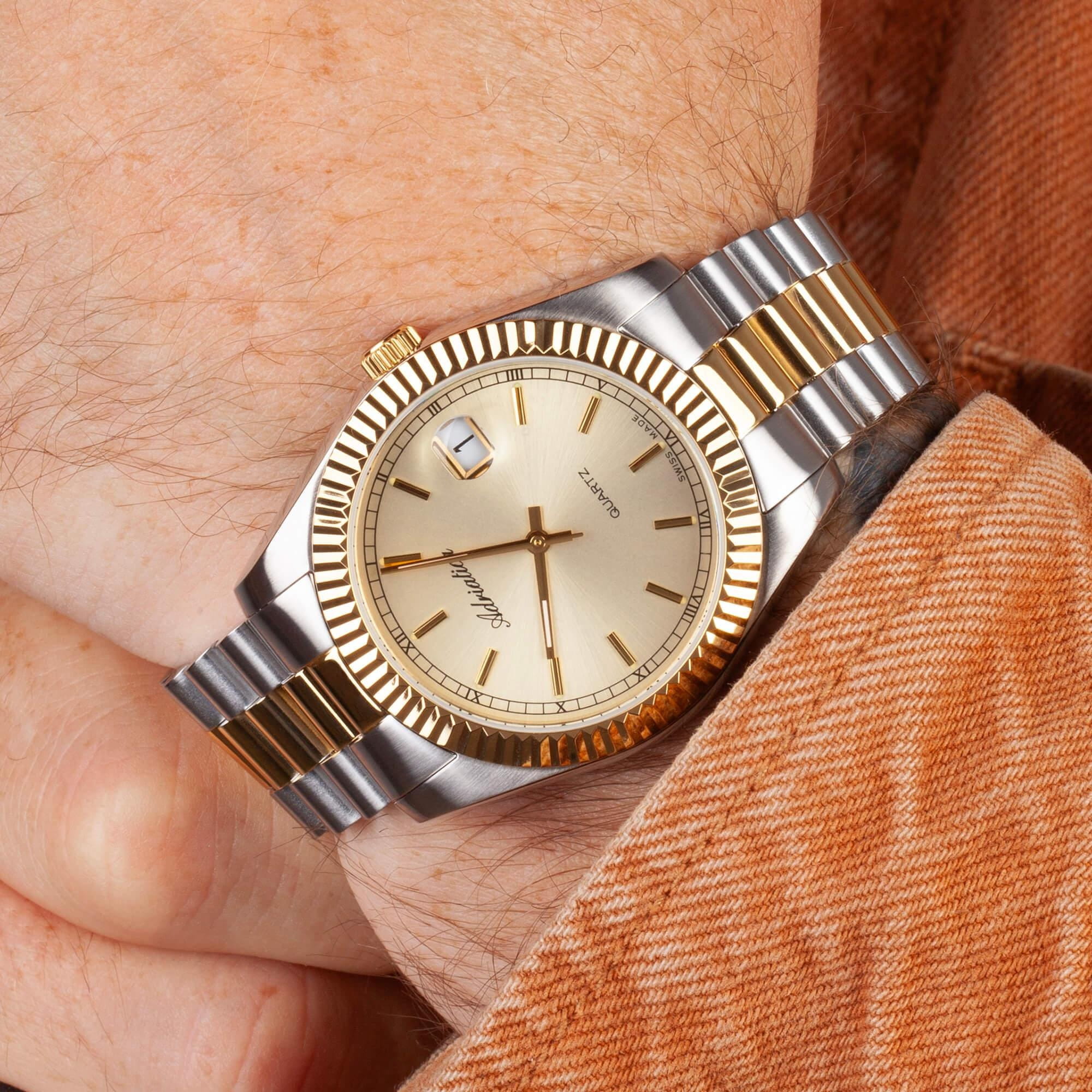 Часы Adriatica A1090.2111Q воплощают в себе классический стиль и надежность, идеально подходящие для современных мужчин. Их золотистый циферблат, защищенный минеральным стекломМинеральное стеклоМинеральное стекло представляет собой искусственно выращенный минерал кварца. Такое стекло отличается особой устойчивостью к повреждениям и царапинам. Уступает по некоторым качествам сапфировому стеклу., заключен в корпус из прочной нержавеющей стали, а их безельБезельВнешний ободок, закрепляющий стекло. В спортивных часах так называется поворотное кольцо с делениями на циферблате, выполняет роль таймера – замеряет отрезки времени на шкале. Неподвижный безель – элемент декора. Однонаправленно вращающийся безель на дайверских часах позволяет фиксировать моменты погружения и выныривания на поверхность. золотистого цвета с PVDPVDУльтратонкое покрытие наносится в технике вакуумного напыления, сочетает в себе нитрид титана особой прочности со слоем золота или оксида хрома. Несёт в себе декоративную или защитную функцию. покрытием. Надежный кварцевый механизм с калибром RONDA 515 обеспечивает точность, а водозащита уровня WR 50 (5 ATM) делает их устойчивыми к воздействию воды. Стальной браслет с частичным PVDPVDУльтратонкое покрытие наносится в технике вакуумного напыления, сочетает в себе нитрид титана особой прочности со слоем золота или оксида хрома. Несёт в себе декоративную или защитную функцию. покрытием и раскладной застёжкойРаскладная застёжкаТакой тип застёжки используется только на браслетах из металла. Она никогда не раскрывается полностью, происходит разделение на 2 и более частей. Раскладывающая застёжка снизит вероятность потери часов к минимуму. подчеркивает элегантный стиль и комфортно сидит на запястье. Часы оснащены функцией отображения даты в окошке в положении 3 часа, что добавляет практичности в повседневной жизни. Люминесцентное покрытиеЛюминесцентное покрытиеПозволяет считывать показания времени в темноте. Производители наносят на стрелки, часовые индексы, безель или поверхность циферблата светонакопительный состав, дающий холодное свечение. на стрелках и метках обеспечивает отличную видимость в темноте.