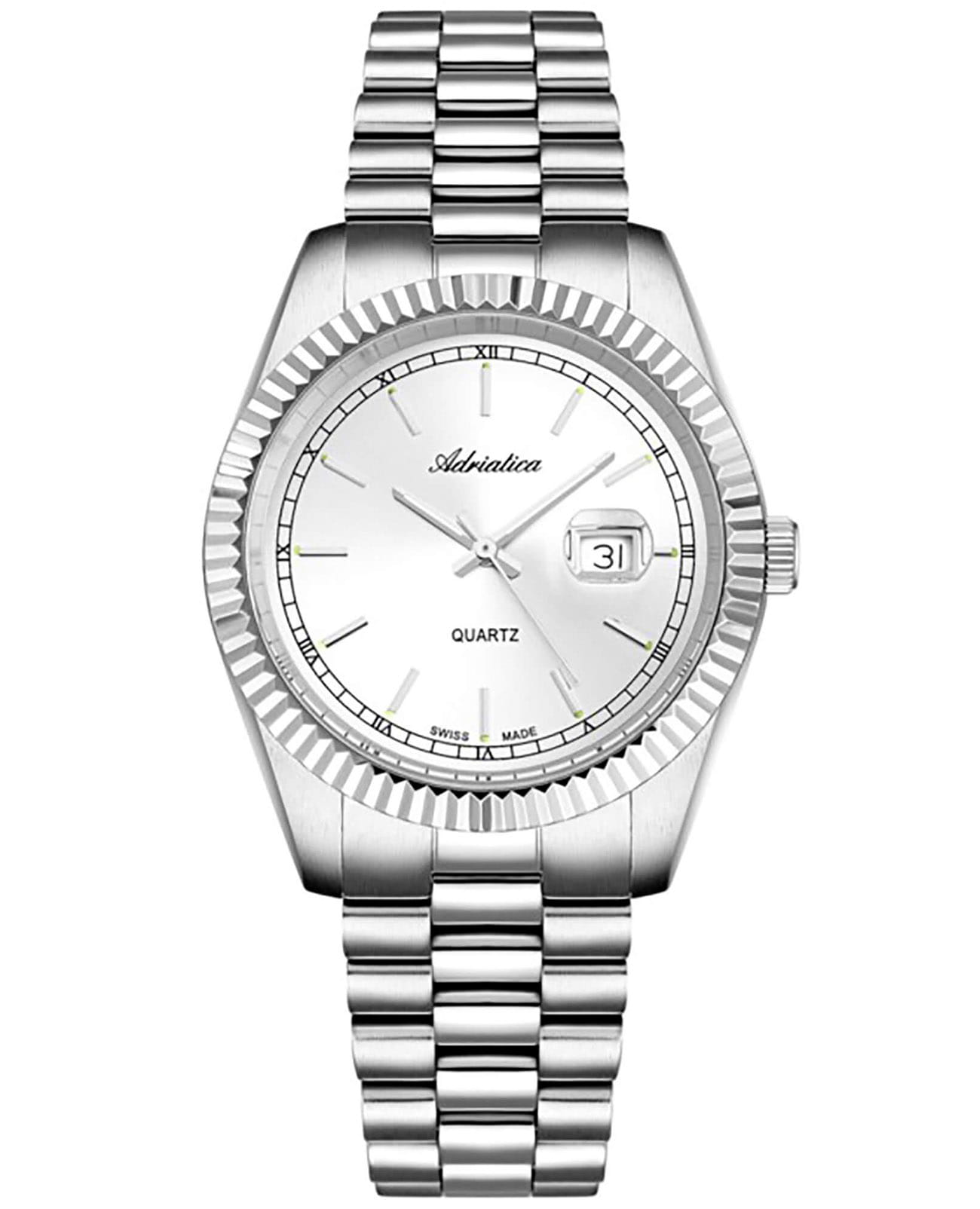 Женские кварцевые часы Adriatica A3090.5113QXL — воплощение швейцарской элегантности в классическом серебристом исполнении. Круглый корпус размером 36 мм из полированной нержавеющей стали, циферблат с солнечной текстурой Sunray и штрихами, окошко даты в положении 3 часов. Стекло — минеральноеМинеральное стеклоМинеральное стекло представляет собой искусственно выращенный минерал кварца. Такое стекло отличается особой устойчивостью к повреждениям и царапинам. Уступает по некоторым качествам сапфировому стеклу. с сапфировым покрытиемСапфировое стеклоПрочный и надёжный материал из кристалла сапфира синтетического происхождения, характеризующийся особой твёрдостью и устойчивостью к царапинам и повреждениям.. Механизм — швейцарский кварцевый Ronda 785. Водонепроницаемость 50 м. Рифлёный безельБезельВнешний ободок, закрепляющий стекло. В спортивных часах так называется поворотное кольцо с делениями на циферблате, выполняет роль таймера – замеряет отрезки времени на шкале. Неподвижный безель – элемент декора. Однонаправленно вращающийся безель на дайверских часах позволяет фиксировать моменты погружения и выныривания на поверхность. и рифлёная заводная головка подчёркивают изысканность дизайна. Браслет — стальной на раскладной застёжкеРаскладная застёжкаТакой тип застёжки используется только на браслетах из металла. Она никогда не раскрывается полностью, происходит разделение на 2 и более частей. Раскладывающая застёжка снизит вероятность потери часов к минимуму.. Идеальный выбор для тех, кто ценит швейцарское качество и утончённую классику.