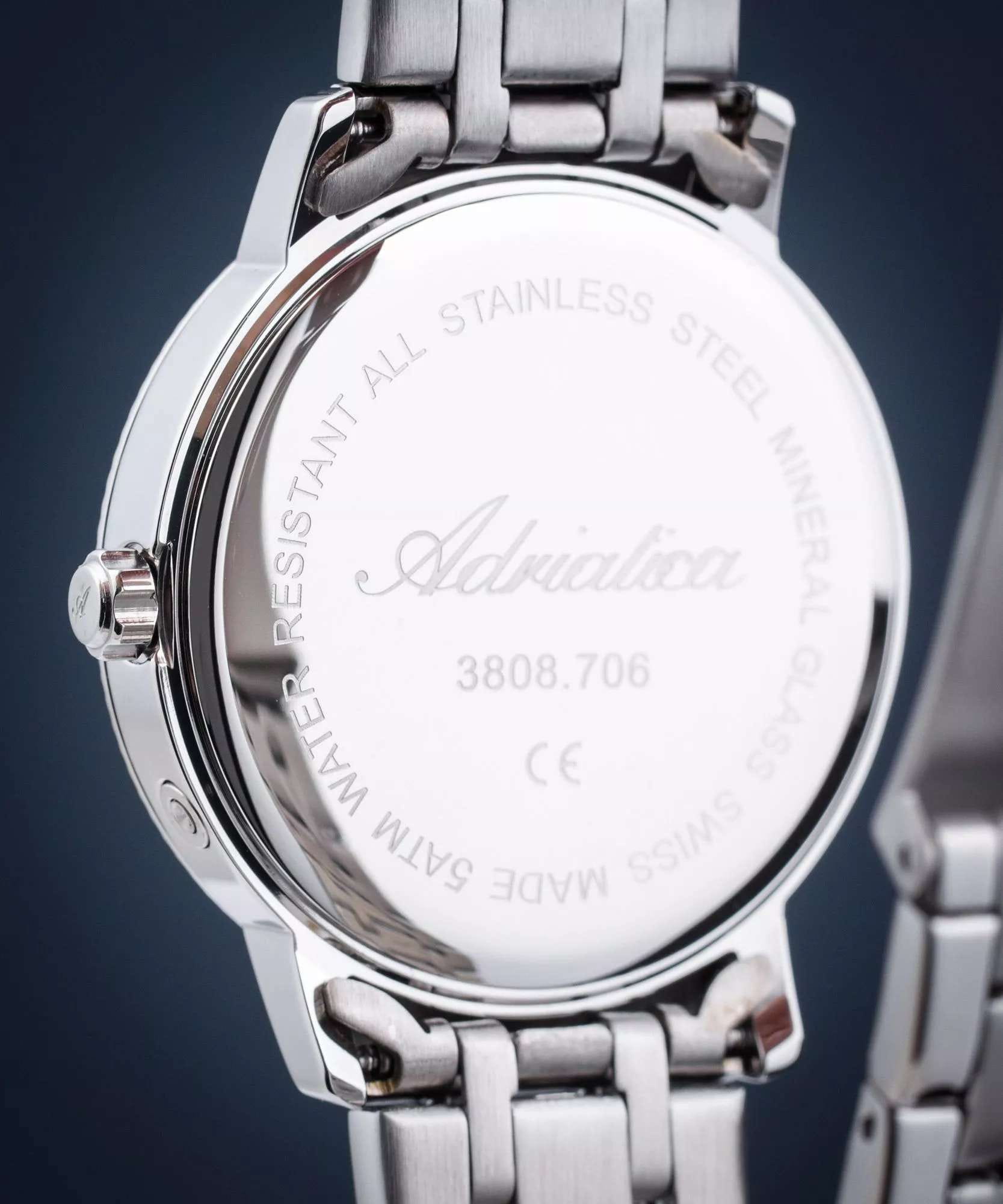 Женские часы Adriatica A3808.51B3QF воплощают в себе утонченность и надежность швейцарского часового искусства. Эти часы идеально подойдут для тех, кто ценит стиль и качество в одном изделии. Серебристый циферблат защищен минеральным стекломМинеральное стеклоМинеральное стекло представляет собой искусственно выращенный минерал кварца. Такое стекло отличается особой устойчивостью к повреждениям и царапинам. Уступает по некоторым качествам сапфировому стеклу. и заключен в корпус, выполненный из нержавеющей стали, диаметром 35 мм, которое придает дополнительную прочность и элегантный вид. Часы оснащены кварцевым механизмом RONDA 706, обеспечивающим высокую точность и надежность. Водозащита 50WR делает их устойчивыми к воздействию воды, что позволяет не беспокоиться о случайных брызгах. Стальной браслет с раскладной застёжкойРаскладная застёжкаТакой тип застёжки используется только на браслетах из металла. Она никогда не раскрывается полностью, происходит разделение на 2 и более частей. Раскладывающая застёжка снизит вероятность потери часов к минимуму. подчеркивает современный стиль и обеспечивает комфортное ношение. День недели и число отображается на отдельных циферблатах. Индикатор фазы Луны.