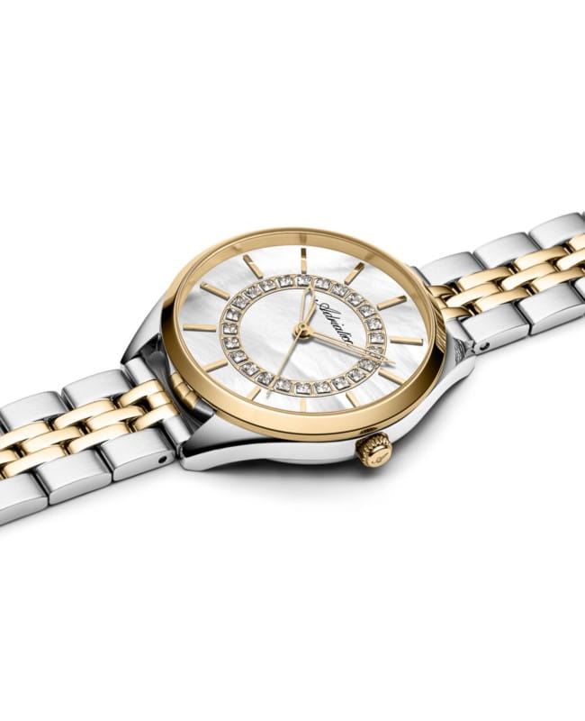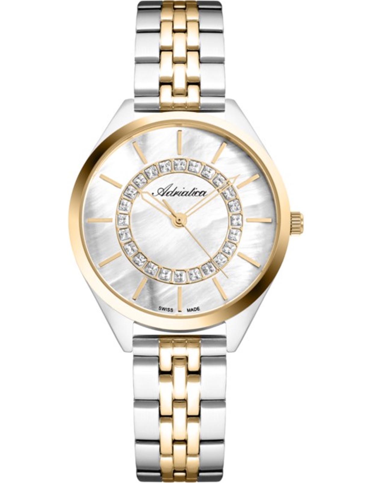 Женские часы с минеральным стекломМинеральное стеклоМинеральное стекло представляет собой искусственно выращенный минерал кварца. Такое стекло отличается особой устойчивостью к повреждениям и царапинам. Уступает по некоторым качествам сапфировому стеклу. Adriatica A3817.211FQ, кварцевый механизм Ronda 783, работающим от батарейки с высокой точностью. Класс водозащиты: 30 метров, позволит защитить корпус от случайных брызг или капель дождя. Корпус часов изготовлен из стали. БезельБезельВнешний ободок, закрепляющий стекло. В спортивных часах так называется поворотное кольцо с делениями на циферблате, выполняет роль таймера – замеряет отрезки времени на шкале. Неподвижный безель – элемент декора. Однонаправленно вращающийся безель на дайверских часах позволяет фиксировать моменты погружения и выныривания на поверхность. с IP-покрытиемIP-покрытиеМетод ионного напыления. Демонстрирует повышенную устойчивость к истиранию, окислению и химическим веществам. Под воздействием высокого давления и температуры около 1500°C молекулы металла надёжно соединяются с частицами корпуса часов..Стальной браслет на раскладной застёжкеРаскладная застёжкаТакой тип застёжки используется только на браслетах из металла. Она никогда не раскрывается полностью, происходит разделение на 2 и более частей. Раскладывающая застёжка снизит вероятность потери часов к минимуму. с IP-покрытиемIP-покрытиеМетод ионного напыления. Демонстрирует повышенную устойчивость к истиранию, окислению и химическим веществам. Под воздействием высокого давления и температуры около 1500°C молекулы металла надёжно соединяются с частицами корпуса часов..