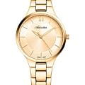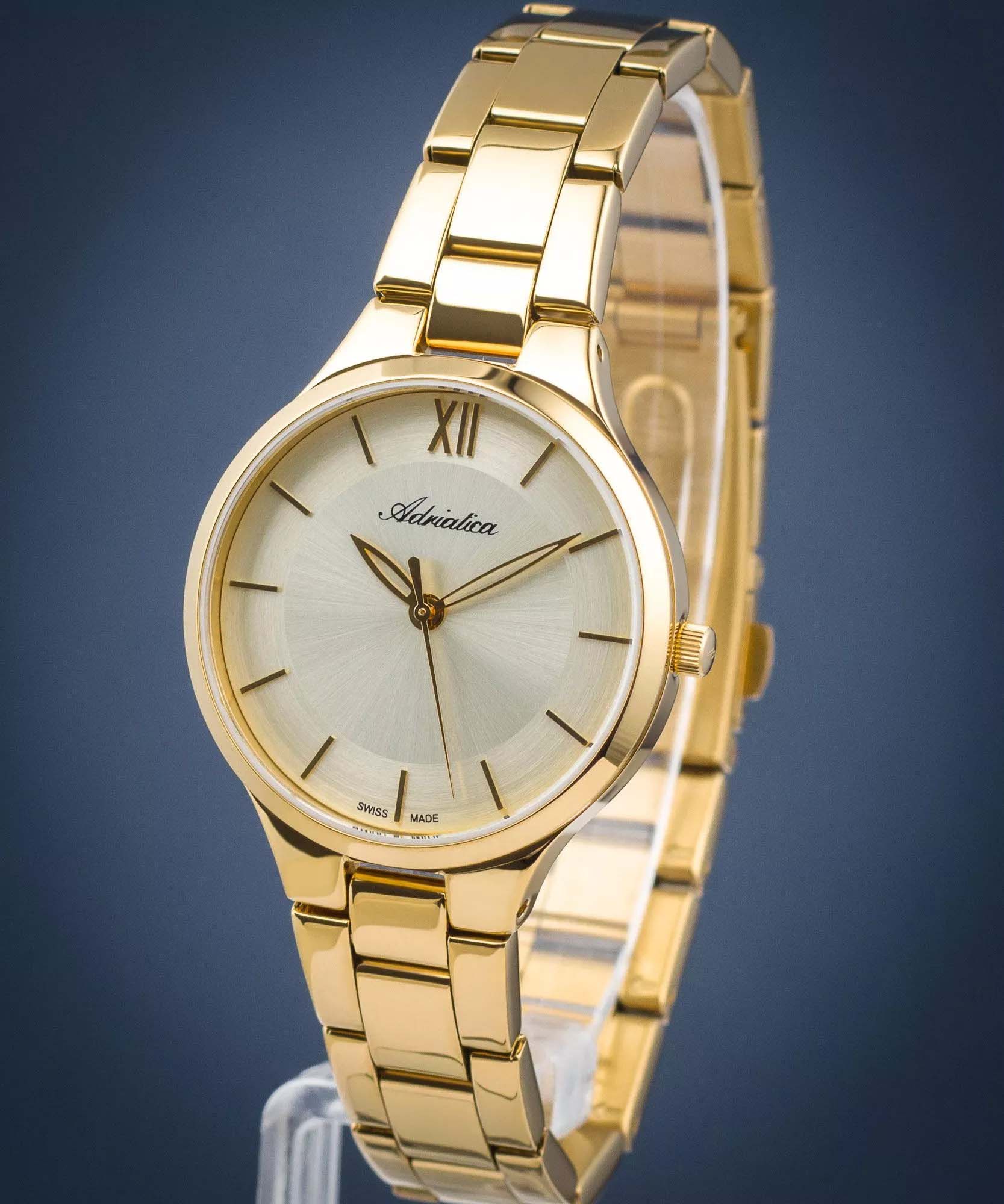 Женские кварцевые часы Adriatica A3823.1161Q — это элегантный аксессуар швейцарского производства с корпусом круглой формы. Корпус и браслет выполнены из стали с PVD-покрытиемPVDУльтратонкое покрытие наносится в технике вакуумного напыления, сочетает в себе нитрид титана особой прочности со слоем золота или оксида хрома. Несёт в себе декоративную или защитную функцию. и защищены минеральным стекломМинеральное стеклоМинеральное стекло представляет собой искусственно выращенный минерал кварца. Такое стекло отличается особой устойчивостью к повреждениям и царапинам. Уступает по некоторым качествам сапфировому стеклу.. Циферблат шампань с эффектом Sunray (солнечные лучи) оформлен штрихами и римской цифрой 12, что придаёт модели изысканный вид. Браслет фиксируется на раскладной застёжкеРаскладная застёжкаТакой тип застёжки используется только на браслетах из металла. Она никогда не раскрывается полностью, происходит разделение на 2 и более частей. Раскладывающая застёжка снизит вероятность потери часов к минимуму.. Часы оснащены точным кварцевым механизмом калибра Ronda 783. Водонепроницаемость 30 м позволит защитить корпус от случайных брызг или капель дождя.