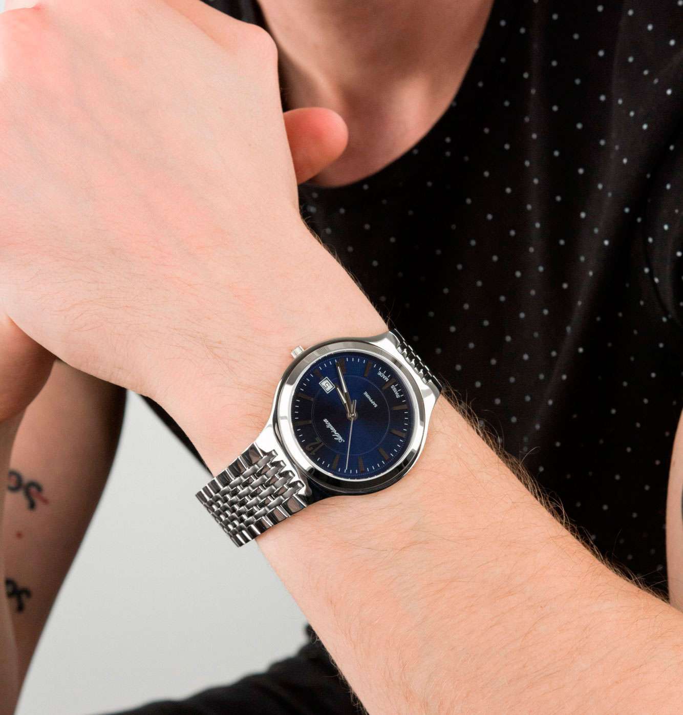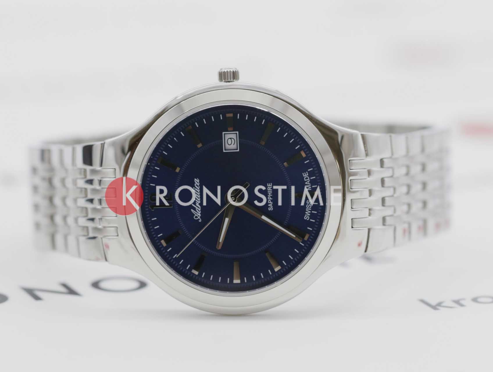 Часы Adriatica A8296.5155Q воплощают в себе элегантность и функциональность, идеально подходящие для современных мужчин, ценящих швейцарское качество. Их синий циферблат, который выполнен по технологии Sunray (солнечные лучи) и защищен сапфировым стекломСапфировое стеклоПрочный и надёжный материал из кристалла сапфира синтетического происхождения, характеризующийся особой твёрдостью и устойчивостью к царапинам и повреждениям., заключен в корпус из нержавеющей стали диаметром 42 мм и толщиной 7 мм. Надежный кварцевый механизм с калибром ETA F06.111 обеспечивает высокую точность, а водозащита 5 ATM делает часы устойчивыми к воздействию воды. Стальной браслет с раскладной застёжкойРаскладная застёжкаТакой тип застёжки используется только на браслетах из металла. Она никогда не раскрывается полностью, происходит разделение на 2 и более частей. Раскладывающая застёжка снизит вероятность потери часов к минимуму. обеспечивает комфортное и надежное ношение. Часы оснащены функцией отображения даты в окошке в положении 3 часа, что добавляет практичности в повседневной жизни. Люминесцентное покрытиеЛюминесцентное покрытиеПозволяет считывать показания времени в темноте. Производители наносят на стрелки, часовые индексы, безель или поверхность циферблата светонакопительный состав, дающий холодное свечение. на стрелках обеспечивает отличную видимость в темноте.