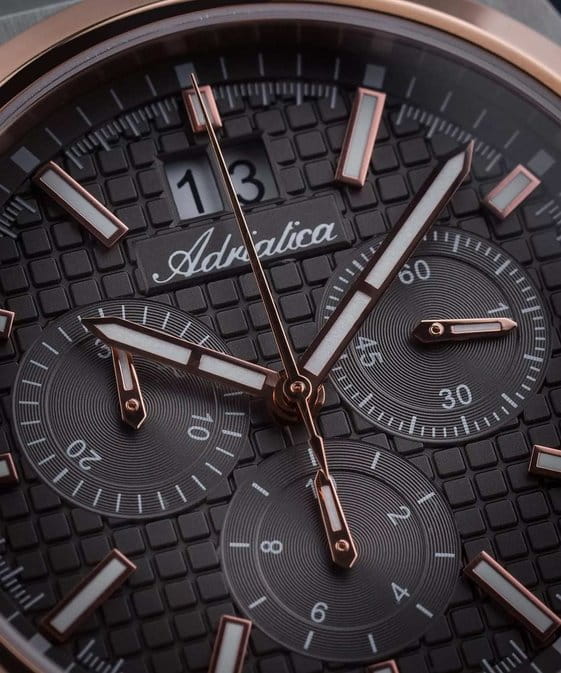 Мужские швейцарские часы-хронографХронографФункция позволяет измерять отрезки времени с особой точностью: часы, минуты, секунды. Верным признаком хронографа является наличие на циферблате 3 дополнительных окошек-счётчиков. с секундомеромСекундомерСекундоме́р — прибор, способный измерять интервалы времени с точностью до долей секунды. Adriatica Premiere A8326.R116CH воплощают в себе элегантность и функциональность, идеально подходящие для современных мужчин, ценящих швейцарское качество. Их черный циферблат защищенный сапфировым стекломСапфировое стеклоПрочный и надёжный материал из кристалла сапфира синтетического происхождения, характеризующийся особой твёрдостью и устойчивостью к царапинам и повреждениям., заключен в корпус из нержавеющей стали диаметром 40 мм и толщиной 10 мм, а на безельБезельВнешний ободок, закрепляющий стекло. В спортивных часах так называется поворотное кольцо с делениями на циферблате, выполняет роль таймера – замеряет отрезки времени на шкале. Неподвижный безель – элемент декора. Однонаправленно вращающийся безель на дайверских часах позволяет фиксировать моменты погружения и выныривания на поверхность. нанесено PVDPVDУльтратонкое покрытие наносится в технике вакуумного напыления, сочетает в себе нитрид титана особой прочности со слоем золота или оксида хрома. Несёт в себе декоративную или защитную функцию. покрытие. Надежный кварцевый механизм с калибром Ronda 5040.B обеспечивает высокую точность, а водозащита 5 ATM делает часы устойчивыми к воздействию воды. Стальной браслет с раскладной застёжкойРаскладная застёжкаТакой тип застёжки используется только на браслетах из металла. Она никогда не раскрывается полностью, происходит разделение на 2 и более частей. Раскладывающая застёжка снизит вероятность потери часов к минимуму. обеспечивает комфортное и надежное ношение. Фактурный циферблат с метками в виде штрихов дополнен рисунком в клетку, а окошко даты находится в положении 12 часов, что добавляет практичности в повседневной жизни. Люминесцентное покрытиеЛюминесцентное покрытиеПозволяет считывать показания времени в темноте. Производители наносят на стрелки, часовые индексы, безель или поверхность циферблата светонакопительный состав, дающий холодное свечение. на стрелках и метках обеспечивает отличную видимость в темноте.
