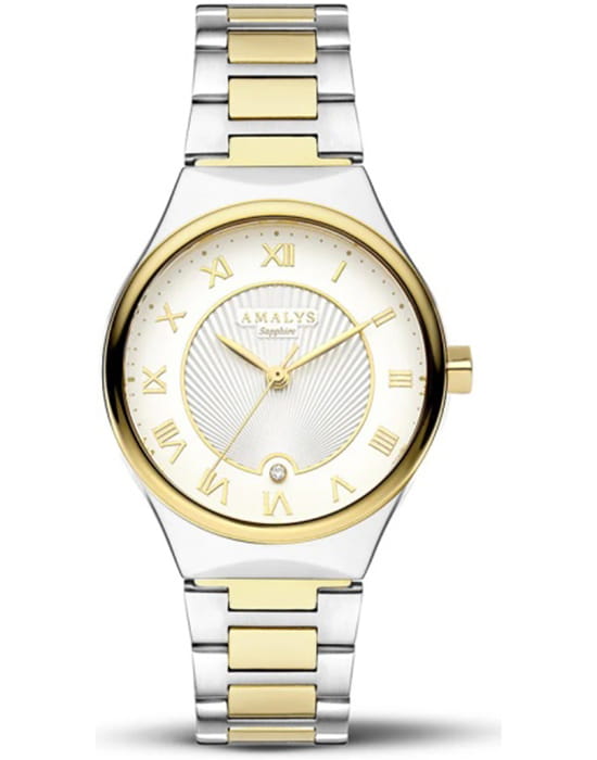 Amalys AMW-159 — женская модель с утончённым современным дизайном, в которой сочетаются минимализм и элегантность. Круглый корпус диаметром 31 мм гармонирует с браслетом с PVD-покрытиемPVDУльтратонкое покрытие наносится в технике вакуумного напыления, сочетает в себе нитрид титана особой прочности со слоем золота или оксида хрома. Несёт в себе декоративную или защитную функцию. шириной 16 мм, выполненным из нержавеющей стали и оснащённым раскладным замкомРаскладной замокДанный вариант застежки используется только на часах с металлическим браслетом. Отличительная особенность такого крепления в том, что длина браслета становится универсальной и вы можете самостоятельно отрегулировать нужный вам размер – застежка просто двигается по браслету часов., обеспечивающим удобство и надёжность при носке. БезельБезельВнешний ободок, закрепляющий стекло. В спортивных часах так называется поворотное кольцо с делениями на циферблате, выполняет роль таймера – замеряет отрезки времени на шкале. Неподвижный безель – элемент декора. Однонаправленно вращающийся безель на дайверских часах позволяет фиксировать моменты погружения и выныривания на поверхность. с PVD-покрытиемPVDУльтратонкое покрытие наносится в технике вакуумного напыления, сочетает в себе нитрид титана особой прочности со слоем золота или оксида хрома. Несёт в себе декоративную или защитную функцию.. Механизм — кварцевый, что гарантирует точный и стабильный ход. Защитную функцию выполняет сапфировое стеклоСапфировое стеклоПрочный и надёжный материал из кристалла сапфира синтетического происхождения, характеризующийся особой твёрдостью и устойчивостью к царапинам и повреждениям., стойкое к царапинам и сохраняющее прозрачность. Водозащита 5 ATM делает модель устойчивой к случайным брызгам и кратковременному контакту с водой. Лаконичный циферблат с декоративным узором и изящными стрелками подчёркивает изысканный характер часов, создавая универсальный образ, подходящий как для повседневных ситуаций, так и для особых случаев.