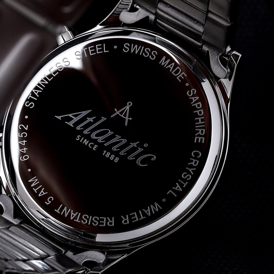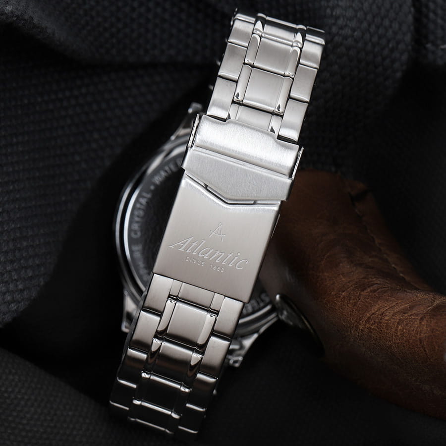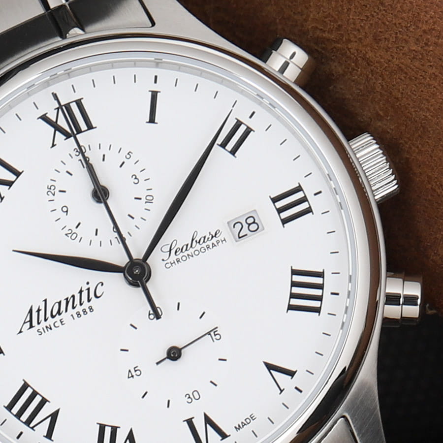 Мужские швейцарские часы-хронографХронографФункция позволяет измерять отрезки времени с особой точностью: часы, минуты, секунды. Верным признаком хронографа является наличие на циферблате 3 дополнительных окошек-счётчиков. с секундомеромСекундомерСекундоме́р — прибор, способный измерять интервалы времени с точностью до долей секунды. Atlantic Seabase 64457.41.18, кварцевый механизм с высокой точностью. Cапфировое стеклоСапфировое стеклоПрочный и надёжный материал из кристалла сапфира синтетического происхождения, характеризующийся особой твёрдостью и устойчивостью к царапинам и повреждениям. устойчивое к появлению царапин и обладающее высокой прозрачностью. Корпус и браслет часов изготовлены из нержавеющей стали. На циферблате расположены римские цифры, два дополнительных индикатора, окошко даты в положении 3 часов. Класс водозащиты: 50 метров, позволит защитить корпус от случайных брызг или капель дождя. Стальной браслет на раскладной застёжкеРаскладная застёжкаТакой тип застёжки используется только на браслетах из металла. Она никогда не раскрывается полностью, происходит разделение на 2 и более частей. Раскладывающая застёжка снизит вероятность потери часов к минимуму..