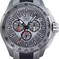Циферблат сложной структуры — в серебристо‑сером тоне с трёхзонным дизайн‑решением: крупная индикация даты, три субциферблата хронографа и широкие стрелки с люминесцентным покрытиемЛюминесцентное покрытиеПозволяет считывать показания времени в темноте. Производители наносят на стрелки, часовые индексы, безель или поверхность циферблата светонакопительный состав, дающий холодное свечение. обеспечивают мгновенное считывание информации. Обод корпуса украшен гравировкой «tachymetre», подчёркивающей спортивную тематику.