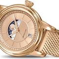 Циферблат в стиле Art Deco украшает усложнение фаз Луны в верхней половине, обрамлённой тонким кольцом облаков. Отмечено окно даты в положении «6 часов». Стрелки и накладные метки обработаны люминесцентным покрытиемЛюминесцентное покрытиеПозволяет считывать показания времени в темноте. Производители наносят на стрелки, часовые индексы, безель или поверхность циферблата светонакопительный состав, дающий холодное свечение. Superluminova — для уверенного считывания в темноте. Поверхность защищена сапфировым стекломСапфировое стеклоПрочный и надёжный материал из кристалла сапфира синтетического происхождения, характеризующийся особой твёрдостью и устойчивостью к царапинам и повреждениям. с антибликовым покрытием.