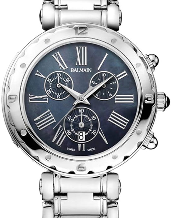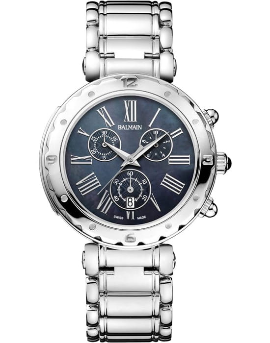 Женские часы Balmain Balmainia B5631.33.62 c хронографомХронографФункция позволяет измерять отрезки времени с особой точностью: часы, минуты, секунды. Верным признаком хронографа является наличие на циферблате 3 дополнительных окошек-счётчиков. кварцевый механизм с высокой точностью. Сапфировое стеклоСапфировое стеклоПрочный и надёжный материал из кристалла сапфира синтетического происхождения, характеризующийся особой твёрдостью и устойчивостью к царапинам и повреждениям. устойчивое к появлению царапин, обладающее высокой прозрачностью. Корпус изготовлен из нержавеющей стали. Класс водозащиты: 50 метров, позволит защитить корпус от случайных брызг или капель дождя. Стальной браслет на застёжке «бабочка» с кнопкамиЗастёжка "бабочка"Такой вид застёжки дополняется предохранителями, помогающими избежать случайного раскрытия браслета. Обладают изящным исполнением. . Стальной БезельБезельВнешний ободок, закрепляющий стекло. В спортивных часах так называется поворотное кольцо с делениями на циферблате, выполняет роль таймера – замеряет отрезки времени на шкале. Неподвижный безель – элемент декора. Однонаправленно вращающийся безель на дайверских часах позволяет фиксировать моменты погружения и выныривания на поверхность.. Календарь в позиции 6 часов.
