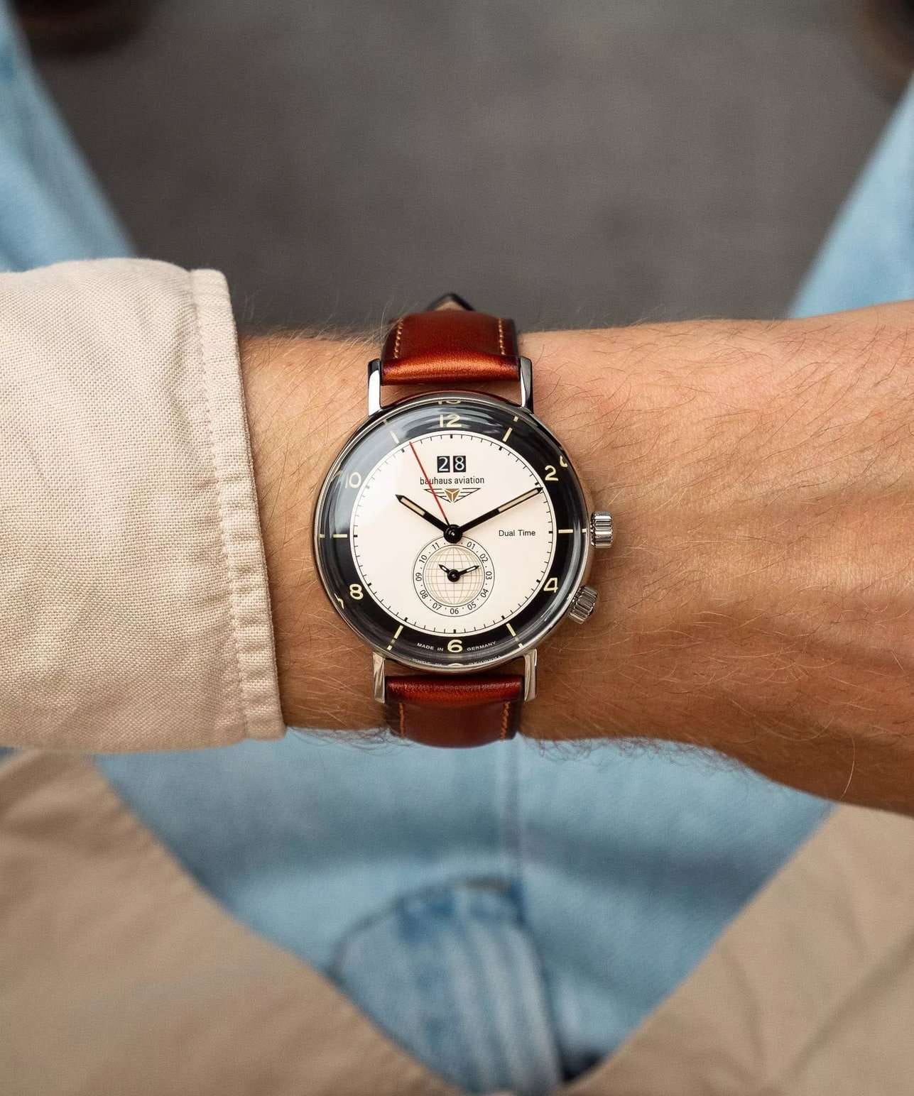 Мужские кварцевые часы Bauhaus — это аксессуар с винтажным пилотским стилем. Корпус диаметром 41 мм и толщиной 11 мм выполнен из нержавеющей стали. Циферблат бежевого цвета оформлен арабскими цифрами и стрелками. Окошко даты расположено в положении 12 часов, также присутствует индикация второго часового пояса. Стрелки и метки с люминесцентным покрытиемЛюминесцентное покрытиеПозволяет считывать показания времени в темноте. Производители наносят на стрелки, часовые индексы, безель или поверхность циферблата светонакопительный состав, дающий холодное свечение., обеспечивающим хорошую читаемость в темноте. Циферблат защищён прочным минеральным стекломМинеральное стеклоМинеральное стекло представляет собой искусственно выращенный минерал кварца. Такое стекло отличается особой устойчивостью к повреждениям и царапинам. Уступает по некоторым качествам сапфировому стеклу. K1. Механизм — швейцарский кварцевый. Часы оснащены коричневым кожаным ремешком на классической пряжке. Водонепроницаемость 50 м позволяет использовать часы в повседневных условиях. Идеальный выбор для тех, кто ценит немецкое качество и ретро-стиль.