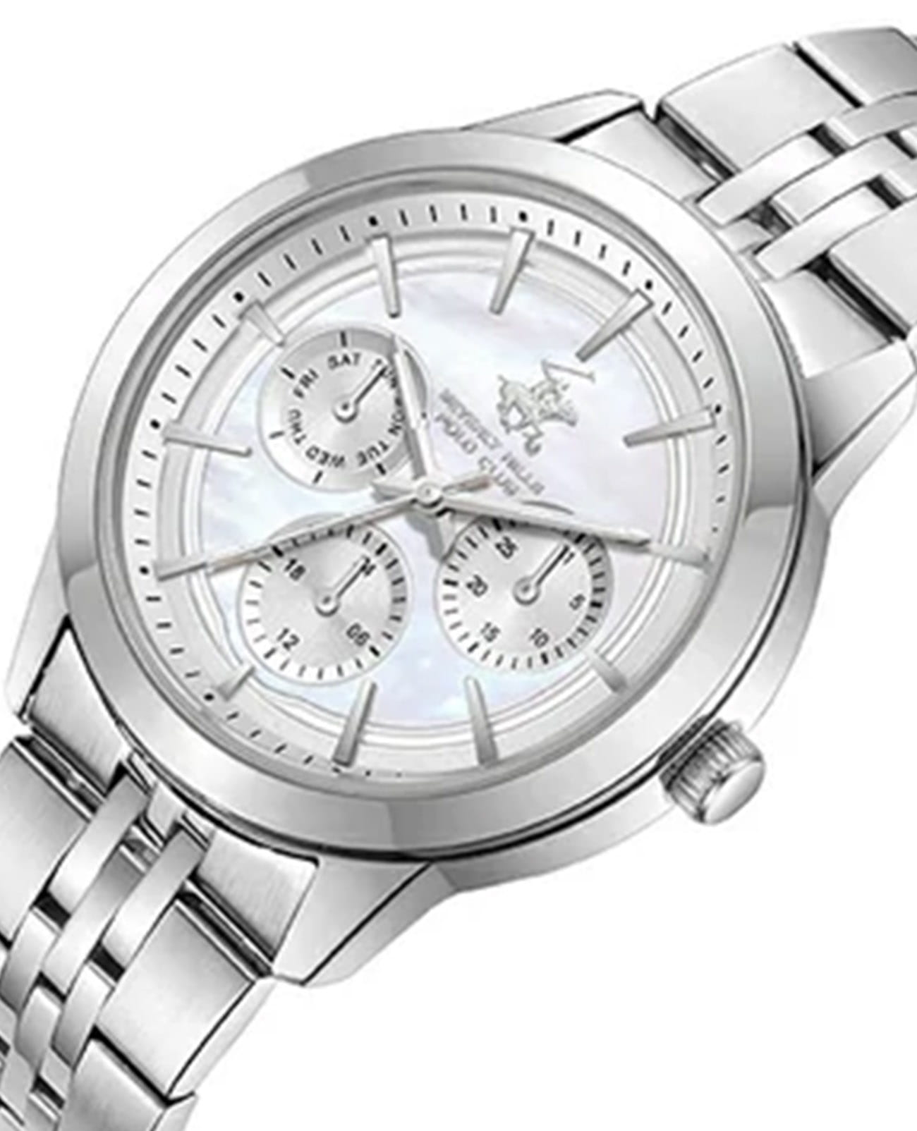 Beverly Hills Polo Club BP3705C.320 – элегантные женские часы, сочетающие стильный дизайн и высокую функциональность. Корпус диаметром 36 мм выполнен из нержавеющей стали, обеспечивающего прочность и долговечность. Циферблат украшен, и защищён минеральным стекломМинеральное стеклоМинеральное стекло представляет собой искусственно выращенный минерал кварца. Такое стекло отличается особой устойчивостью к повреждениям и царапинам. Уступает по некоторым качествам сапфировому стеклу., устойчивым к царапинам. Часы оснащены точным кварцевым механизмом, гарантирующим надёжное отображение времени. Браслет из нержавеющей стали на раскладной застёжкеРаскладная застёжкаТакой тип застёжки используется только на браслетах из металла. Она никогда не раскрывается полностью, происходит разделение на 2 и более частей. Раскладывающая застёжка снизит вероятность потери часов к минимуму., обеспечивающей комфортное ношение и надёжную фиксацию на запястье. Водозащита до 50 метров позволяет использовать часы в повседневной жизни, включая кратковременное погружение в воду.