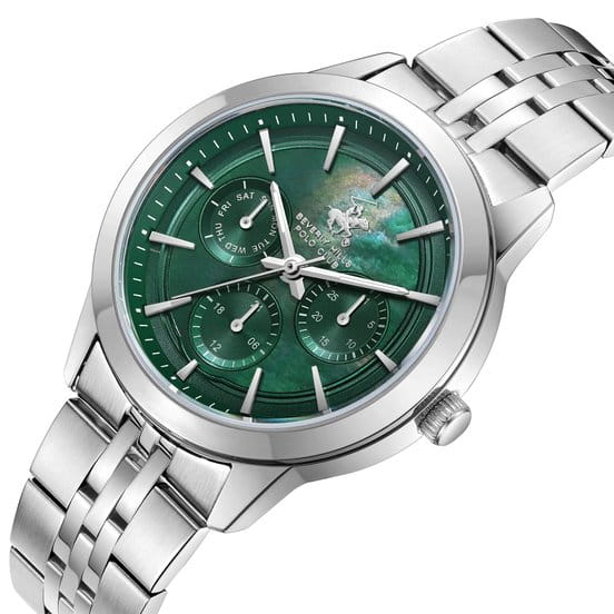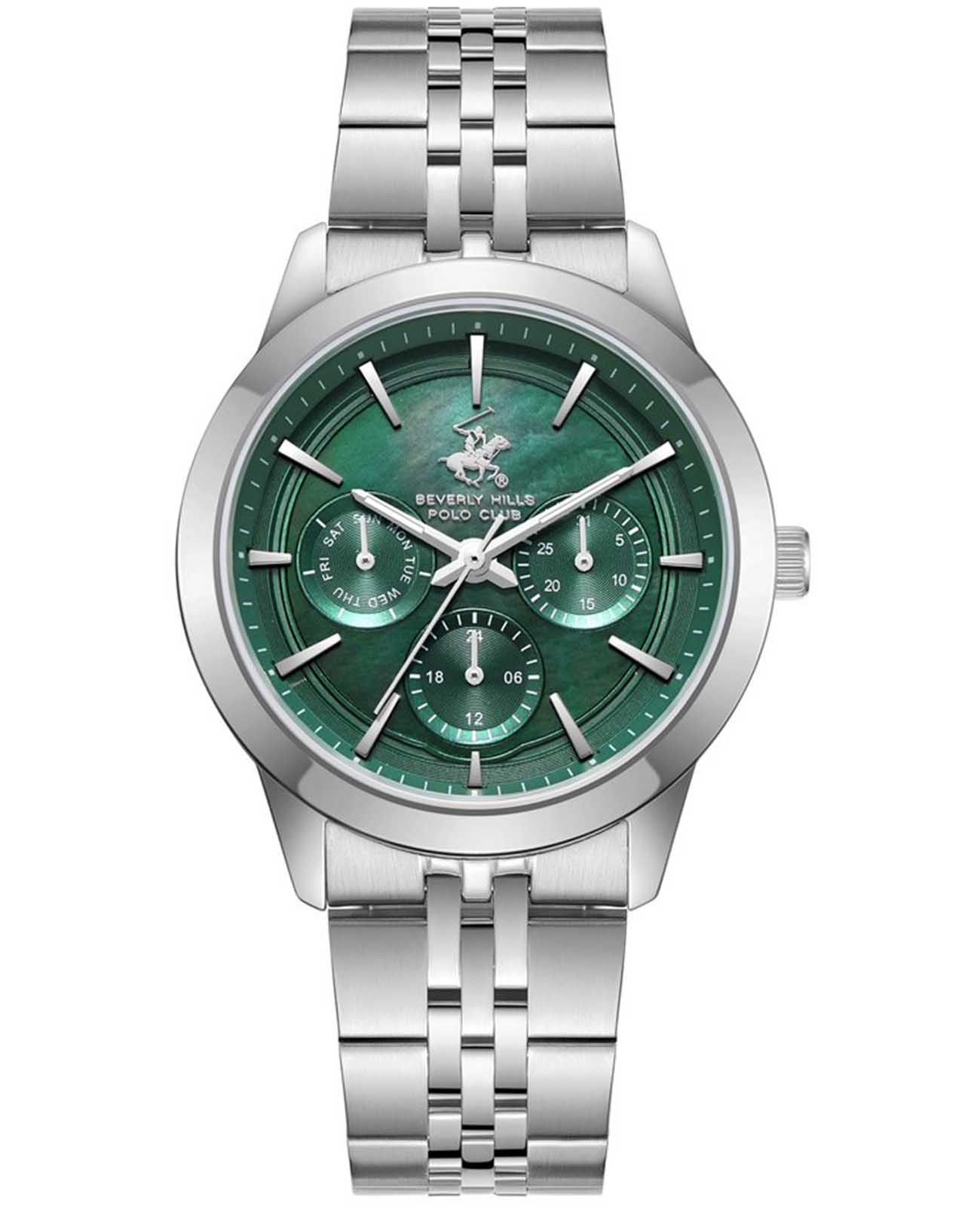 Beverly Hills Polo Club BP3705C.370 – элегантные женские часы, сочетающие стильный дизайн и высокую функциональность. Корпус диаметром 36 мм выполнен из суперметалла, обеспечивающего прочность и долговечность. Циферблат украшен, и защищён минеральным стекломМинеральное стеклоМинеральное стекло представляет собой искусственно выращенный минерал кварца. Такое стекло отличается особой устойчивостью к повреждениям и царапинам. Уступает по некоторым качествам сапфировому стеклу., устойчивым к царапинам. Часы оснащены точным кварцевым механизмом, гарантирующим надёжное отображение времени. Браслет из нержавеющей стали на раскладной застёжкеРаскладная застёжкаТакой тип застёжки используется только на браслетах из металла. Она никогда не раскрывается полностью, происходит разделение на 2 и более частей. Раскладывающая застёжка снизит вероятность потери часов к минимуму., обеспечивающей комфортное ношение и надёжную фиксацию на запястье. Водозащита до 50 метров (5 ATM) позволяет использовать часы в повседневной жизни, включая кратковременное погружение в воду.