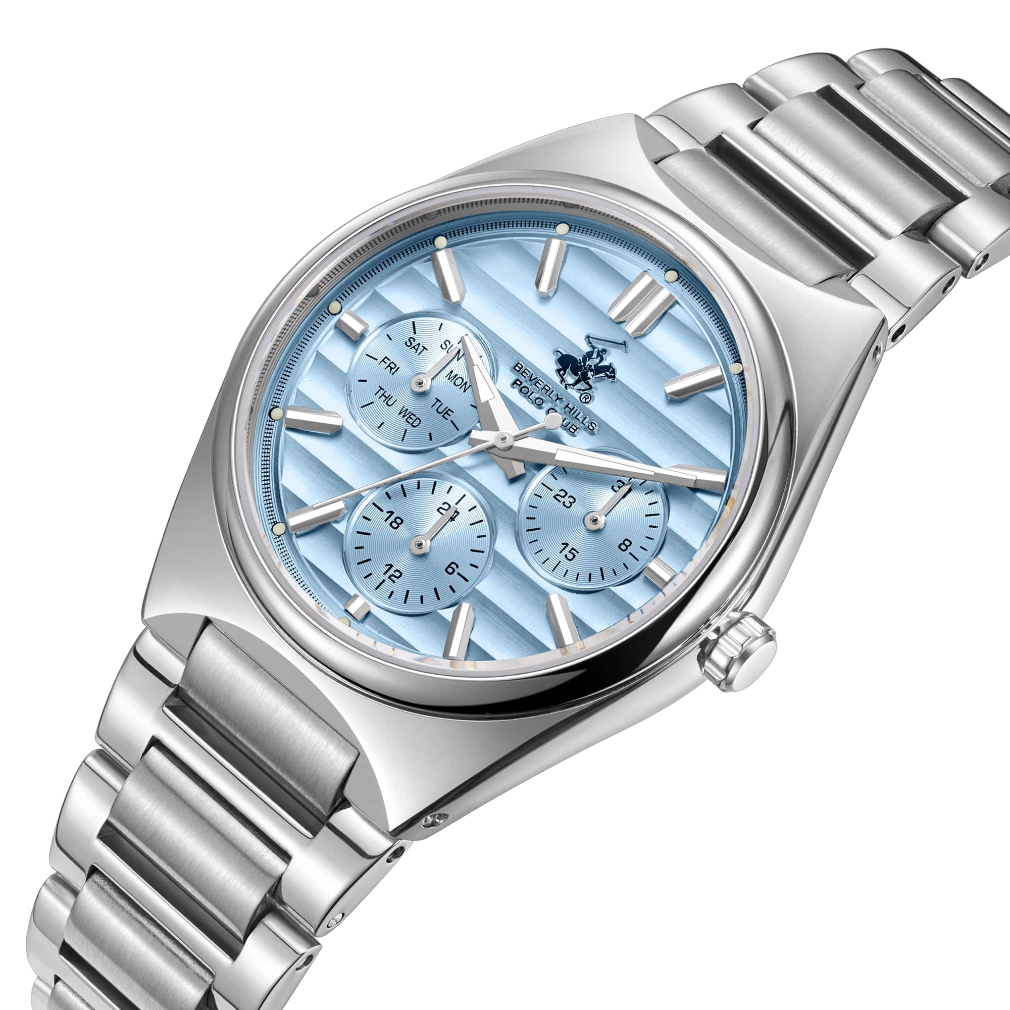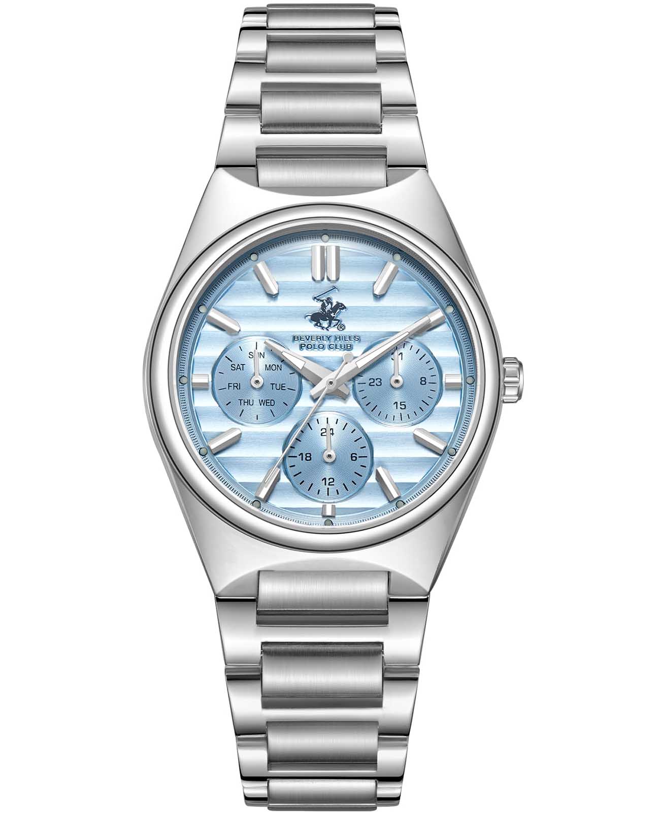 Beverly Hills Polo Club BP3746C.300 – элегантные женские часы, сочетающие стильный дизайн и высокую функциональность. Корпус диаметром 34 мм выполнен из суперметалла, обеспечивающего прочность и долговечность. Циферблат украшен, и защищён минеральным стекломМинеральное стеклоМинеральное стекло представляет собой искусственно выращенный минерал кварца. Такое стекло отличается особой устойчивостью к повреждениям и царапинам. Уступает по некоторым качествам сапфировому стеклу., устойчивым к царапинам. Часы оснащены точным кварцевым механизмом, гарантирующим надёжное отображение времени. Браслет из нержавеющей стали на застёжке-бабочке с кнопкамиЗастёжка "бабочка"Такой вид застёжки дополняется предохранителями, помогающими избежать случайного раскрытия браслета. Обладают изящным исполнением. , обеспечивающей комфортное ношение и надёжную фиксацию на запястье. Водозащита до 50 метров (5 ATM) позволяет использовать часы в повседневной жизни, включая кратковременное погружение в воду.
