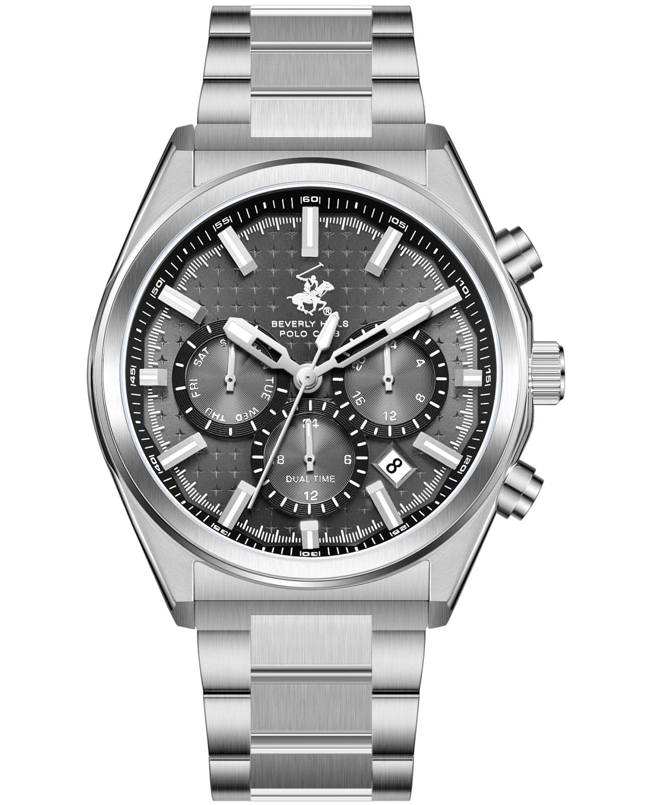Мужские кварцевые часы Beverly Hills Polo Club — это стильный аксессуар из коллекции Summer 25. Корпус диаметром 42 мм выполнен из стали. Циферблат серого цвета оформлен линейными индексами. Указатели дня недели, даты и 24-часового формата времени вынесены на отдельные субциферблаты. Циферблат защищён минеральным стекломМинеральное стеклоМинеральное стекло представляет собой искусственно выращенный минерал кварца. Такое стекло отличается особой устойчивостью к повреждениям и царапинам. Уступает по некоторым качествам сапфировому стеклу.. Часы оснащены стальным браслетом с застёжкой «бабочка» с кнопкамиЗастёжка "бабочка"Такой вид застёжки дополняется предохранителями, помогающими избежать случайного раскрытия браслета. Обладают изящным исполнением. . Водонепроницаемость 50 м позволяет использовать часы в повседневных условиях. Идеальный выбор для тех, кто ценит модный дизайн и надёжность.
