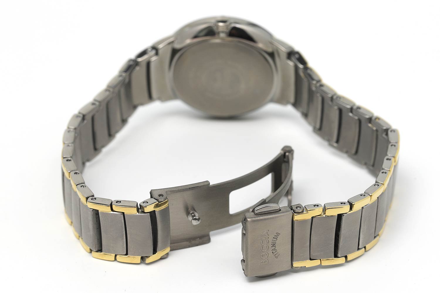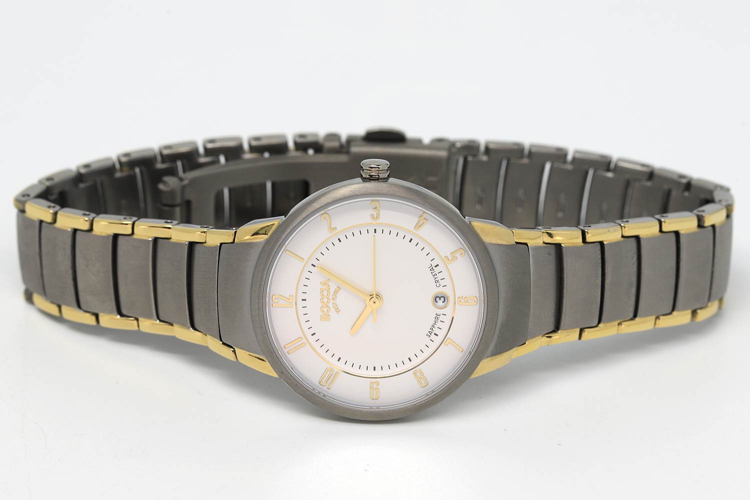 Женские наручные часы Boccia Titanium 3158-02 с надёжным кварцевым механизмом. Корпус и браслет часов изготовлены из титана с частичным PVD-покрытиемPVDУльтратонкое покрытие наносится в технике вакуумного напыления, сочетает в себе нитрид титана особой прочности со слоем золота или оксида хрома. Несёт в себе декоративную или защитную функцию.. Стальной браслет на раскладной застёжкеРаскладная застёжкаТакой тип застёжки используется только на браслетах из металла. Она никогда не раскрывается полностью, происходит разделение на 2 и более частей. Раскладывающая застёжка снизит вероятность потери часов к минимуму.. Окошко даты находится в положении 6 часов. Класс водозащиты: 50 метров, позволит защитить корпус от случайных брызг или капель дождя. Сапфировое стеклоСапфировое стеклоПрочный и надёжный материал из кристалла сапфира синтетического происхождения, характеризующийся особой твёрдостью и устойчивостью к царапинам и повреждениям. с антибликовым покрытием, устойчивое к мелким механическим повреждениям.