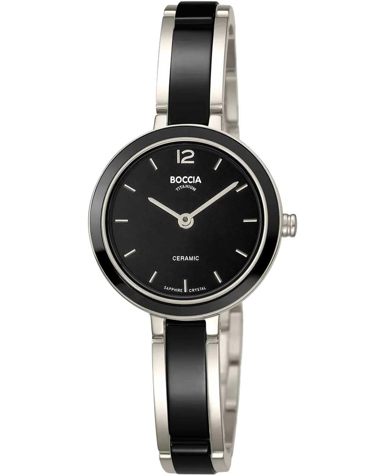 Женские наручные часы Boccia Titanium 3333-02 с надёжным кварцевым механизмом. Корпус и браслет часов изготовлены из титана с керамическими вставками. Сапфировое стеклоСапфировое стеклоПрочный и надёжный материал из кристалла сапфира синтетического происхождения, характеризующийся особой твёрдостью и устойчивостью к царапинам и повреждениям. устойчивое к мелким механическим повреждениям. Класс водозащиты: 50 метров, позволит защитить корпус от случайных брызг или капель дождя. Титановый браслет на раскладной застёжкеРаскладная застёжкаТакой тип застёжки используется только на браслетах из металла. Она никогда не раскрывается полностью, происходит разделение на 2 и более частей. Раскладывающая застёжка снизит вероятность потери часов к минимуму..