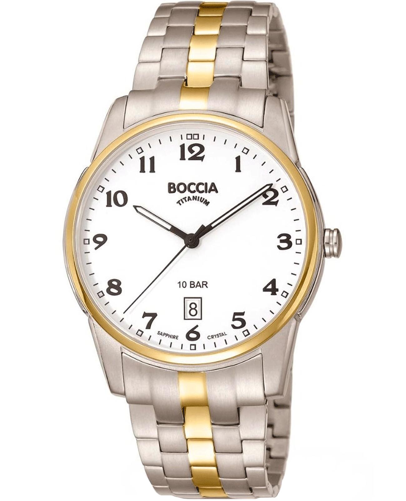 Мужские немецкие титановые часы Boccia Titanium 3632-03, кварцевый механизм с высокой точностью. Сапфировое стеклоСапфировое стеклоПрочный и надёжный материал из кристалла сапфира синтетического происхождения, характеризующийся особой твёрдостью и устойчивостью к царапинам и повреждениям. устойчивое к появлению царапин, обладающее высокой прозрачностью. Корпус изготовлен из титана. Стрелки и метки с люминесцентным покрытиемЛюминесцентное покрытиеПозволяет считывать показания времени в темноте. Производители наносят на стрелки, часовые индексы, безель или поверхность циферблата светонакопительный состав, дающий холодное свечение.. Окошко даты в положении 6 часов. Класс водозащиты: 100 метров, позволит плавать, нырять и заниматься другими водными видами спорта. Браслет из титана с частичным PVD-покрытиемPVDУльтратонкое покрытие наносится в технике вакуумного напыления, сочетает в себе нитрид титана особой прочности со слоем золота или оксида хрома. Несёт в себе декоративную или защитную функцию. на раскладной застёжкеРаскладная застёжкаТакой тип застёжки используется только на браслетах из металла. Она никогда не раскрывается полностью, происходит разделение на 2 и более частей. Раскладывающая застёжка снизит вероятность потери часов к минимуму..