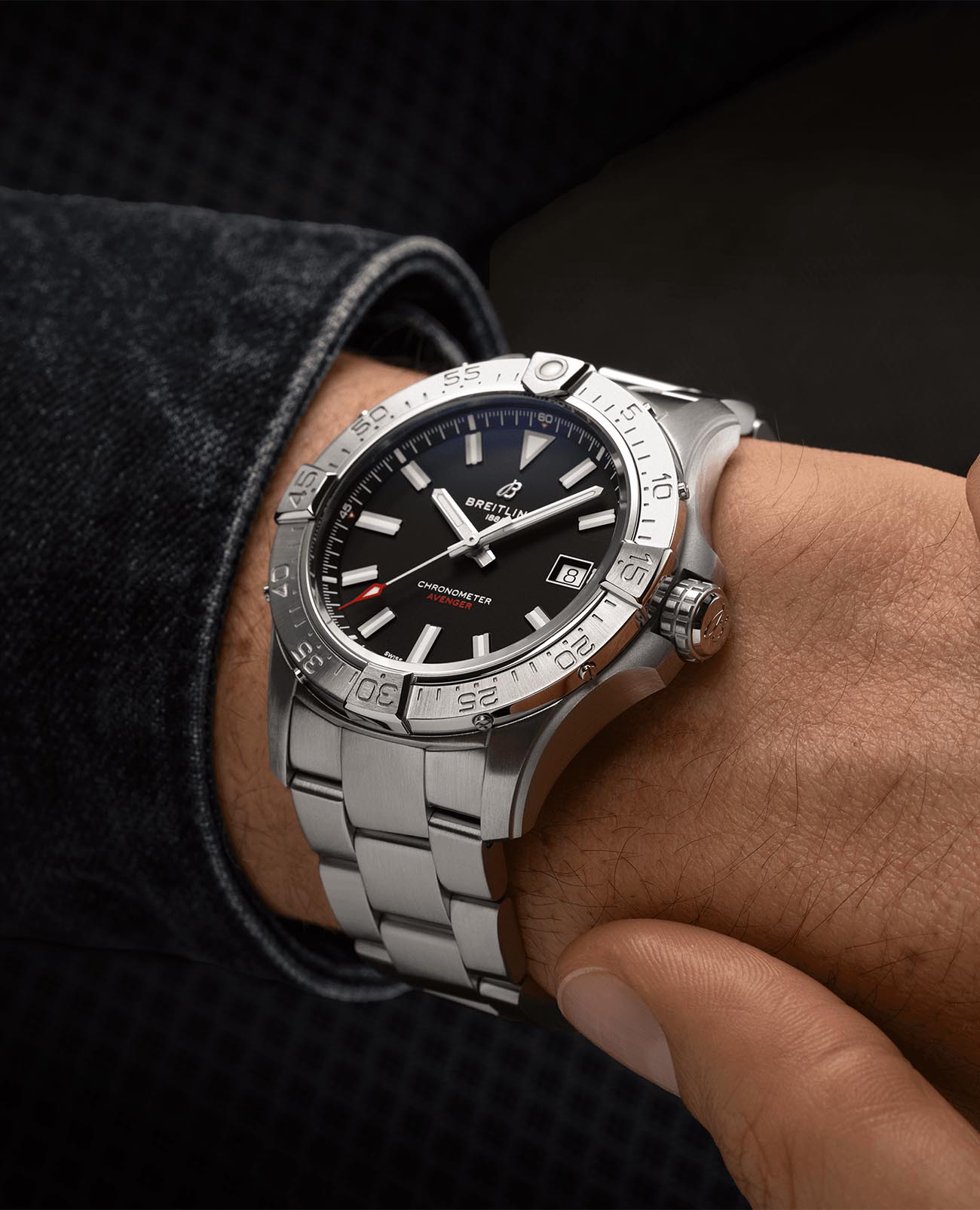 Мужские наручные часы Breitling Avenger Automatic 42 A17328101B1A1 с надёжным автоматическим механизмом. Сапфировое стеклоСапфировое стеклоПрочный и надёжный материал из кристалла сапфира синтетического происхождения, характеризующийся особой твёрдостью и устойчивостью к царапинам и повреждениям. повышенной прозрачности, устойчивое к мелким механическим повреждениям. Вращающийся безельБезельВнешний ободок, закрепляющий стекло. В спортивных часах так называется поворотное кольцо с делениями на циферблате, выполняет роль таймера – замеряет отрезки времени на шкале. Неподвижный безель – элемент декора. Однонаправленно вращающийся безель на дайверских часах позволяет фиксировать моменты погружения и выныривания на поверхность.. Окошко даты находится в положении 3 часа. Стрелки и метки с люминесцентным покрытиемЛюминесцентное покрытиеПозволяет считывать показания времени в темноте. Производители наносят на стрелки, часовые индексы, безель или поверхность циферблата светонакопительный состав, дающий холодное свечение.. Стальной браслет на стандартной застёжке. Класс водозащиты: 300 метров, позволит плавать, нырять и заниматься другими водными видами спорта.