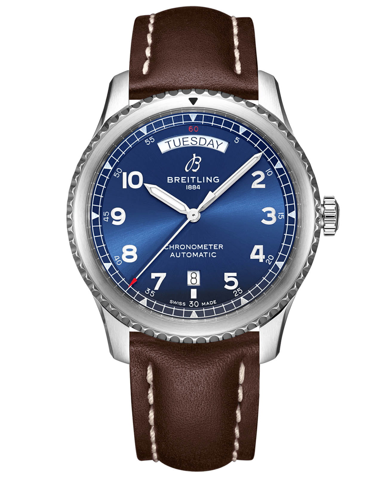 Модель Aviator 8 Automatic Day & Date 41 A45330101C1X2 отображает день недели, дату и время. Индикатор дня недели размещен в положении «12 часов» симметрично дате, в положении «6 часов». «Сердцем» модели этих автоматических наручных часов является калибр Breitling Caliber 45, а двунаправленный ротор автоподзавода обеспечивает запас хода свыше 40 часов.