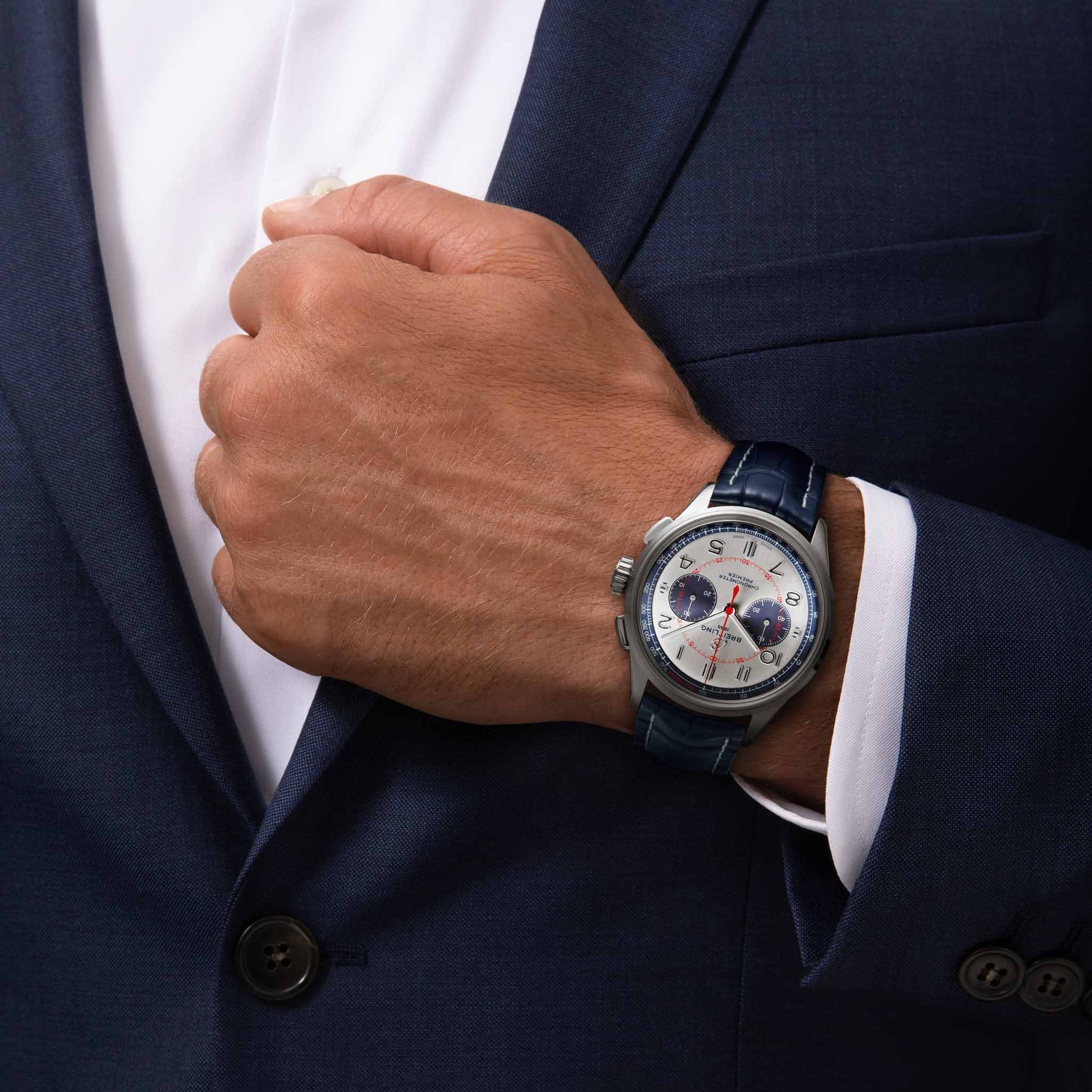 Синий ремешок из кожи аллигатора с красными и синими акцентами напоминает цветовое решение отделки салона концепт-кара. На вертикально сатинированном серебристом циферблате так же, как и на бортовых часах Bentley, нанесены арабские цифры: в автомобильных часах это цифры 3, 6, 9 и 12, а на циферблате новых Breitling – 1, 2, 4, 5, 7, 8, 10 и 11.
