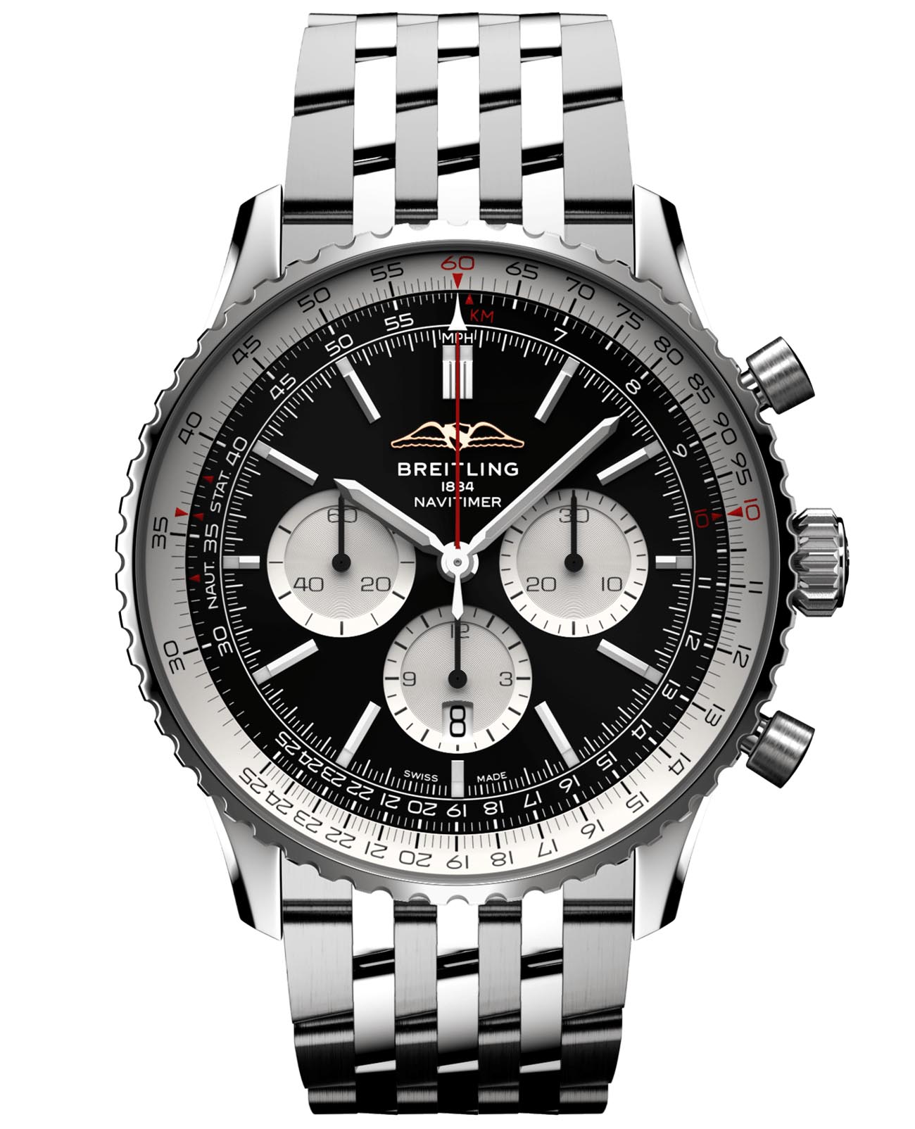 Мужские швейцарские часы-хронографХронографФункция позволяет измерять отрезки времени с особой точностью: часы, минуты, секунды. Верным признаком хронографа является наличие на циферблате 3 дополнительных окошек-счётчиков. с секундомеромСекундомерСекундоме́р — прибор, способный измерять интервалы времени с точностью до долей секунды. Breitling Navitimer B01 Chronograph 46 AB0137211B1A1, механический механизм (автоматический калибр) с высокой точностью. Сапфировое стеклоСапфировое стеклоПрочный и надёжный материал из кристалла сапфира синтетического происхождения, характеризующийся особой твёрдостью и устойчивостью к царапинам и повреждениям. устойчивое к появлению царапин, обладающее высокой прозрачностью. Класс водозащиты: 30 метров, позволит защитить корпус от случайных брызг или капель дождя. Корпус часов изготовлен из стали. Стальной браслет с застёжкой-бабочкой с кнопкамиЗастёжка "бабочка"Такой вид застёжки дополняется предохранителями, помогающими избежать случайного раскрытия браслета. Обладают изящным исполнением. . Шкала тахиметраТахиметрРазмеченная шкала, располагается на ободке или безеле часов. Тахиметр позволяет рассчитать скорость на определённом участке пути, расстояние измеряется в километрах или милях. на циферблате. Часы имеют сертификат COSCСертификат COSCОфициальный сертификат, подтверждающий то, что часы ходят с особо высокой точностью. Для получения документа часы подвергаются тестовым испытаниям, разработанным швейцарским институтом тестирования хронометров COSC. Допустимая норма для механических часов -4/+6 секунд в день, для кварцевых моделей +/- 0,07 секунд в день.. Окошко даты находится в положении 6 часов. Стрелки и метки с люминесцентным покрытиемЛюминесцентное покрытиеПозволяет считывать показания времени в темноте. Производители наносят на стрелки, часовые индексы, безель или поверхность циферблата светонакопительный состав, дающий холодное свечение..