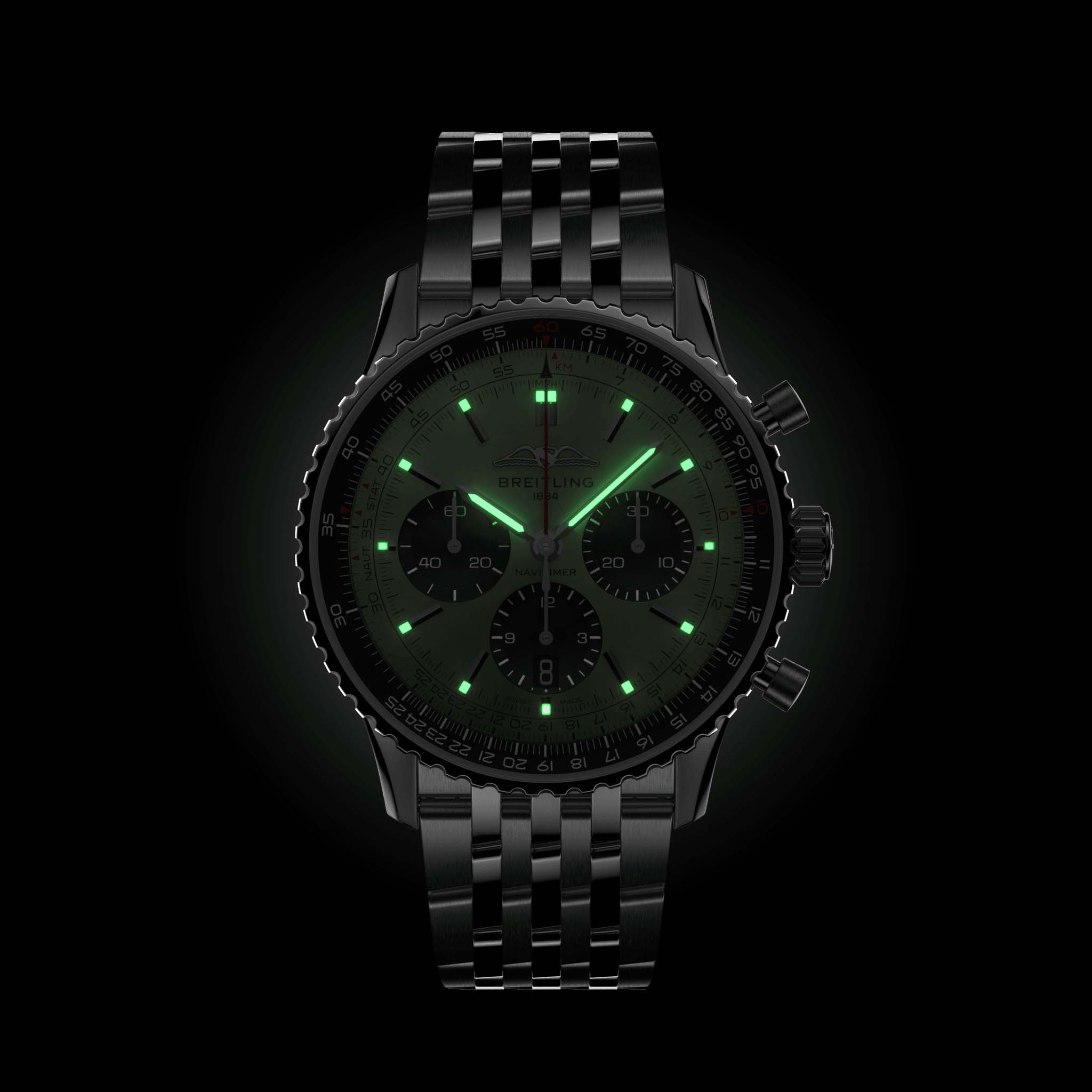 Мужские швейцарские часы-хронографХронографФункция позволяет измерять отрезки времени с особой точностью: часы, минуты, секунды. Верным признаком хронографа является наличие на циферблате 3 дополнительных окошек-счётчиков. с секундомеромСекундомерСекундоме́р — прибор, способный измерять интервалы времени с точностью до долей секунды. Breitling Navitimer B01 Chronograph 43 AB0138241L1A1, механический механизм (автоматический калибр) с высокой точностью. Сапфировое стеклоСапфировое стеклоПрочный и надёжный материал из кристалла сапфира синтетического происхождения, характеризующийся особой твёрдостью и устойчивостью к царапинам и повреждениям. с антибликовым покрытием устойчивое к появлению царапин, обладающее высокой прозрачностью. Класс водозащиты: 30 метров, позволит защитить корпус от случайных брызг или капель дождя.  Корпус часов изготовлен из стали. Шкала тахиметраТахиметрРазмеченная шкала, располагается на ободке или безеле часов. Тахиметр позволяет рассчитать скорость на определённом участке пути, расстояние измеряется в километрах или милях. на циферблате. Часы имеют сертификат COSCСертификат COSCОфициальный сертификат, подтверждающий то, что часы ходят с особо высокой точностью. Для получения документа часы подвергаются тестовым испытаниям, разработанным швейцарским институтом тестирования хронометров COSC. Допустимая норма для механических часов -4/+6 секунд в день, для кварцевых моделей +/- 0,07 секунд в день.. Окошко даты находится в положении 6 часов. Стрелки и метки с люминесцентным покрытиемЛюминесцентное покрытиеПозволяет считывать показания времени в темноте. Производители наносят на стрелки, часовые индексы, безель или поверхность циферблата светонакопительный состав, дающий холодное свечение.. Стальной браслет с застёжкой-бабочкой с кнопкамиЗастёжка "бабочка"Такой вид застёжки дополняется предохранителями, помогающими избежать случайного раскрытия браслета. Обладают изящным исполнением. .