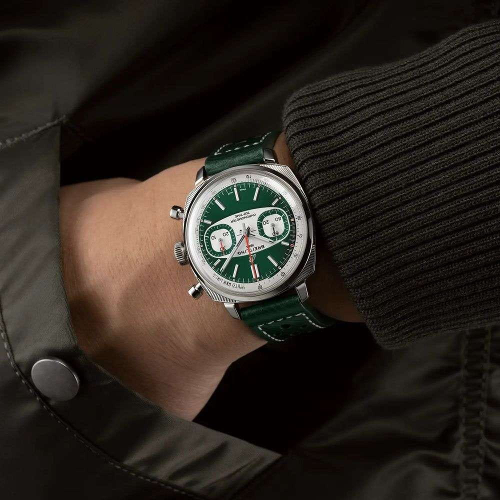 Breitling Top Time B01 Racing Green AB01771A1L1X1 — лимитированная модель, сочетающая винтажную эстетику и современные технологии, вдохновлённая гоночными хронографами 1960-х годов. Корпус диаметром 38 мм выполнен из нержавеющей стали с полированной отделкой. На задней крышке — гравировка «One of 750», указывающая на ограниченный тираж. Циферблат защищён сапфировым стекломСапфировое стеклоПрочный и надёжный материал из кристалла сапфира синтетического происхождения, характеризующийся особой твёрдостью и устойчивостью к царапинам и повреждениям. с антибликовым покрытиемАнтибликовое покрытиеСлой оксида металла в 0,13-0,3 микрон, благодаря которому стекло часов не бликует и не отражает свет. Антибликовое покрытие уменьшает отражение света в 10 раз, обеспечивая отличную читаемость показателей циферблата., устойчивым к царапинам и бликам. Зелёный циферблат оформлен в характерном стиле «surfboard» с двумя белыми субциферблатами. Разметка и стрелки покрыты люминесцентным покрытиемЛюминесцентное покрытиеПозволяет считывать показания времени в темноте. Производители наносят на стрелки, часовые индексы, безель или поверхность циферблата светонакопительный состав, дающий холодное свечение. для хорошей читаемости в темноте. Модель оснащена автоматическим хронографомХронографФункция позволяет измерять отрезки времени с особой точностью: часы, минуты, секунды. Верным признаком хронографа является наличие на циферблате 3 дополнительных окошек-счётчиков. калибра Breitling B01 с 1/4-секундной точностью, 30-минутным счётчиком, запасом хода до 70 часов и сертификацией COSCСертификат COSCОфициальный сертификат, подтверждающий то, что часы ходят с особо высокой точностью. Для получения документа часы подвергаются тестовым испытаниям, разработанным швейцарским институтом тестирования хронометров COSC. Допустимая норма для механических часов -4/+6 секунд в день, для кварцевых моделей +/- 0,07 секунд в день.. Часы укомплектованы перфорированным зелёным кожаным ремешком на стандартной застежке, которая обеспечивает комфорт и надёжную фиксацию. Водонепроницаемость 100 метров делает модель подходящей для активного образа жизни и повседневной эксплуатации. Top Time B01 Racing Green — яркое переосмысление классического хронографа для поклонников винтажного стиля и швейцарской точности.