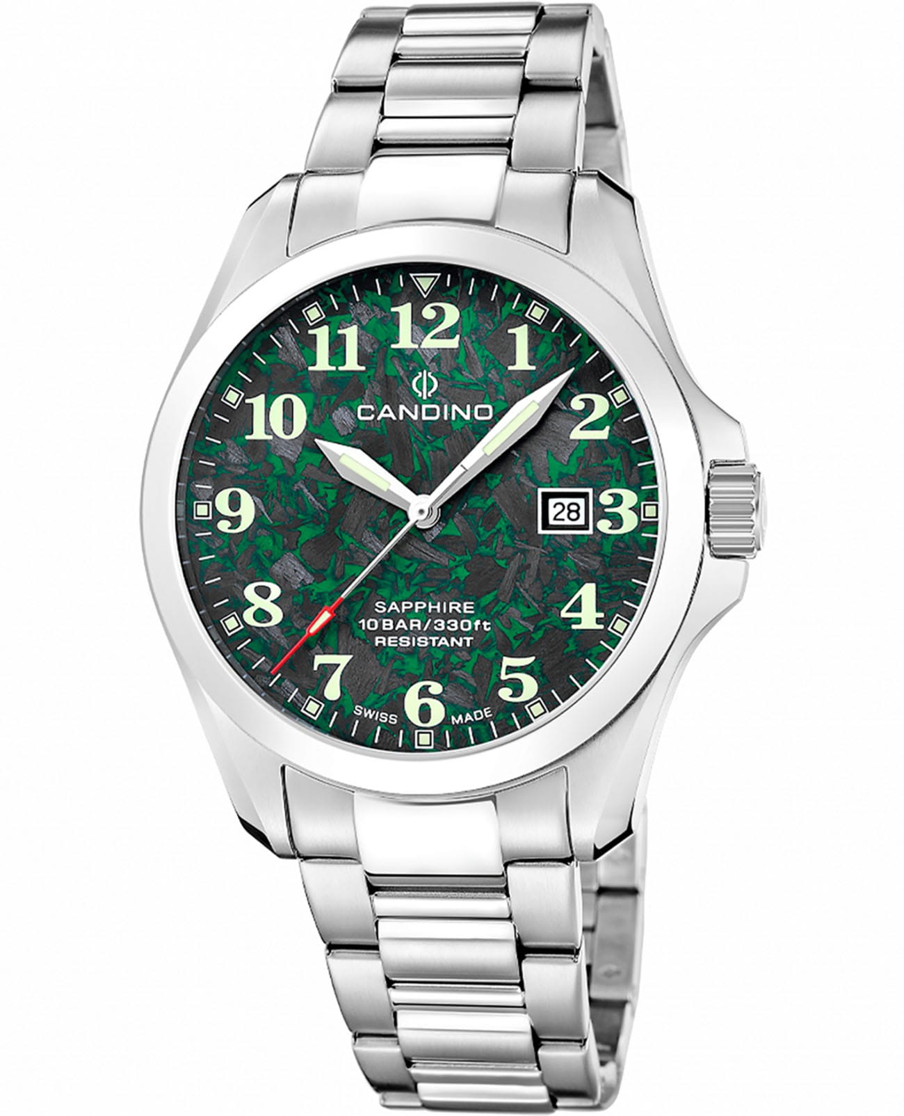Мужские кварцевые часы Candino C4785/3 — это стильный и надёжный аксессуар швейцарского производства, сочетающий элегантность и функциональность. Корпус круглой формы выполнен из нержавеющей стали и защищён сапфировым стекломСапфировое стеклоПрочный и надёжный материал из кристалла сапфира синтетического происхождения, характеризующийся особой твёрдостью и устойчивостью к царапинам и повреждениям., устойчивым к царапинам. Циферблат зелёного цвета оформлен штрихами в качестве индикации, а стрелки и метки оснащены люминесцентным покрытиемЛюминесцентное покрытиеПозволяет считывать показания времени в темноте. Производители наносят на стрелки, часовые индексы, безель или поверхность циферблата светонакопительный состав, дающий холодное свечение., обеспечивающим хорошую читаемость в темноте. Окошко даты расположено на отметке 3 часа, что делает часы практичными в повседневном использовании. Браслет из нержавеющей стали фиксируется на раскладной застёжкеРаскладная застёжкаТакой тип застёжки используется только на браслетах из металла. Она никогда не раскрывается полностью, происходит разделение на 2 и более частей. Раскладывающая застёжка снизит вероятность потери часов к минимуму., обеспечивая удобство и надёжность ношения. Водонепроницаемость 50 м позволяет использовать часы в повседневных условиях, защищая от случайных брызг и капель дождя. Модель подчёркивает индивидуальность и хороший вкус владельца, оставаясь универсальным выбором для любого образа. В комплекте предусмотрены два ремешка из кожи и текстиля.