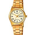 Японские женские часы Casio Collection LTP-V006G-9B с минеральным стекломМинеральное стеклоМинеральное стекло представляет собой искусственно выращенный минерал кварца. Такое стекло отличается особой устойчивостью к повреждениям и царапинам. Уступает по некоторым качествам сапфировому стеклу. из коллекции LTP изящно смотрятся на запястье, они привлекают классическим исполнением и правильной геометрией. Минималистичная модель станет отличным решением для любого случая: на работу, переговоры с деловыми партнёрами, прогулку с друзьями или праздничный вечер. Отсутствуют лишние детали, что позволяет часам быть актуальными на долгие годы. Корпус выполнен из нержавеющей стали с IP-покрытиемIP-покрытиеМетод ионного напыления. Демонстрирует повышенную устойчивость к истиранию, окислению и химическим веществам. Под воздействием высокого давления и температуры около 1500°C молекулы металла надёжно соединяются с частицами корпуса часов.. Модель комплектуется надёжным механизмом, точность хода которого составляет +/- 20 сек/мес.