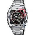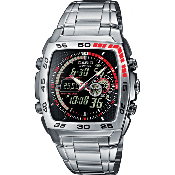 Стильные  наручные кварцевые мужские часы. Циферблат черного цвета с контрастными элементами дизайна. Корпус часов выполнен из нержавеющей стали. Минеральное стекло устойчиво к появлению царапин. Часы надежно удерживаются на руке браслетом из высококачественной стали с антикоррозийными свойствами. Водонепроницаемость 100М. Часы оснащены секундомером, таймером, будильником, вечным календарем, вторым часовым поясом, термометром.