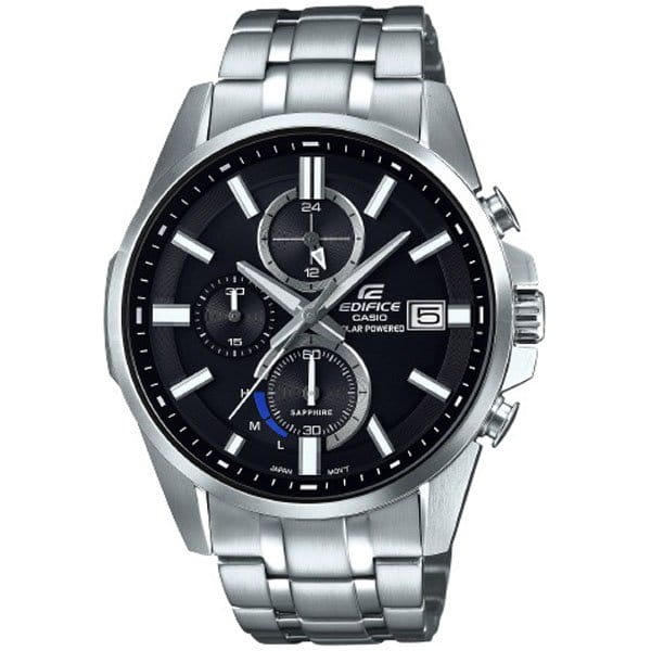 Стильные наручные кварцевые мужские часы на солнечной батарейке. Индикатор уровня заряда аккумулятора (Этот индикатор отображает текущий уровень заряда аккумулятора). Круглый корпус и браслет часов выполнены из высокопрочной стали. Черный фон циферблата с контрастными элементами дизайна. Водонепроницаемость часов составляет 10 ATM. Сапфировое стекло, устойчивое к появлению царапин. Часы оснащены хронографом. Модный и современный аксессуар.