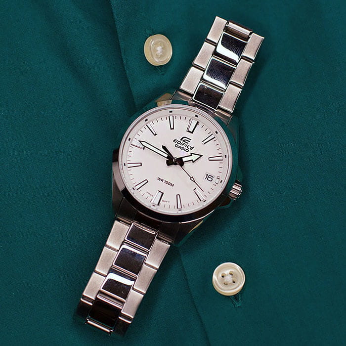 Брендовый аксессуар из серии EFV-100 будет отлично смотреться как с деловым костюмом, так и с повседневной одеждой. Светлый циферблат дополнен контрастными стрелками и метками, секундная стрелка облегчает читаемость показателей благодаря крупному наконечнику. Минималистичные часы выполнены из нержавеющей стали 316L, материал отличается долговечностью и устойчивостью к царапинам. Кварцевый механизм работает от батарейки, срок её службы составит 3 года. Люминесцентная подсветка NeobriteЛюминесцентное покрытиеПозволяет считывать показания времени в темноте. Производители наносят на стрелки, часовые индексы, безель или поверхность циферблата светонакопительный состав, дающий холодное свечение.. Водостойкость 10 бар. Минеральное стекло. Прямоугольная апертура даты. Габариты: 48 x 42 x 10,9 мм.