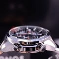 Общее исполнение аксессуара выдержано в автомобильной стилистике, тёмный циферблат отличается оригинальным расположением счётчиков. Наручные часы оснащены технологией BluetoothBluetoothСовременная технология, позволяющая синхронизировать часы с телефоном и переносить данные. Часы с Bluetooth расширяют возможности вашего смартфона и делают его использование ещё более удобным. с низким потреблением энергии, позволяющей часам считывать информацию с интернет-сервера точного времени и обеспечивать абсолютную точность времени. Питание происходит за счёт солнечной батареи - . Водонепроницаемость 100 метров. Минеральное стекло. Люминесцентная подсветкаЛюминесцентное покрытиеПозволяет считывать показания времени в темноте. Производители наносят на стрелки, часовые индексы, безель или поверхность циферблата светонакопительный состав, дающий холодное свечение.. Наличие авиарежима. Функции: уведомление о полученных сообщениях по электронной почте, поиск телефона, отображение числа и дня недели, секундомер, будильник, тахиметрТахиметрРазмеченная шкала, располагается на ободке или безеле часов. Тахиметр позволяет рассчитать скорость на определённом участке пути, расстояние измеряется в километрах или милях., расчёт средней скорости пройденного маршрута. Габариты: 52 x 48,1 x 14,2 мм.