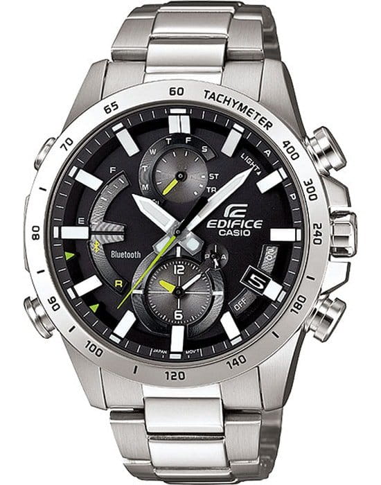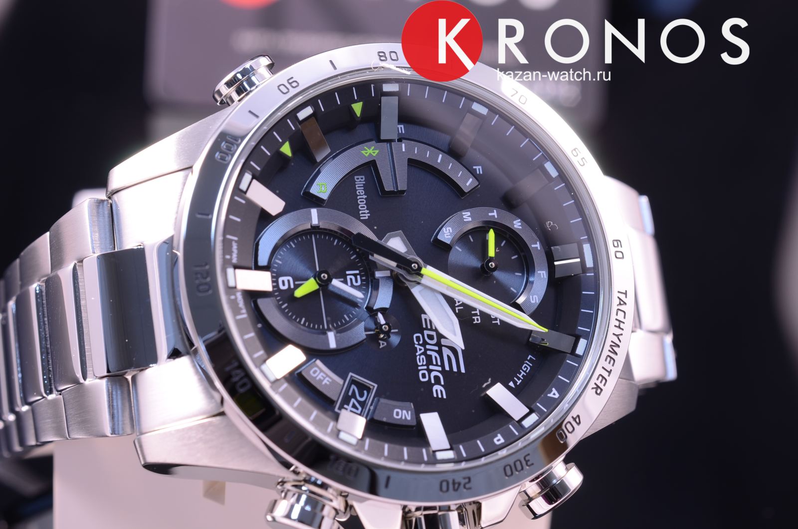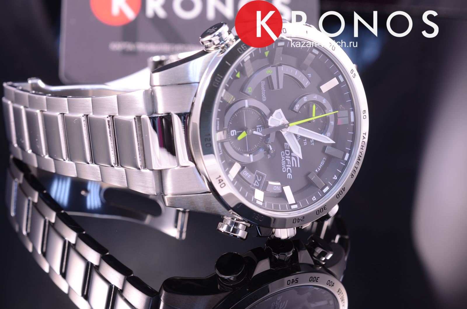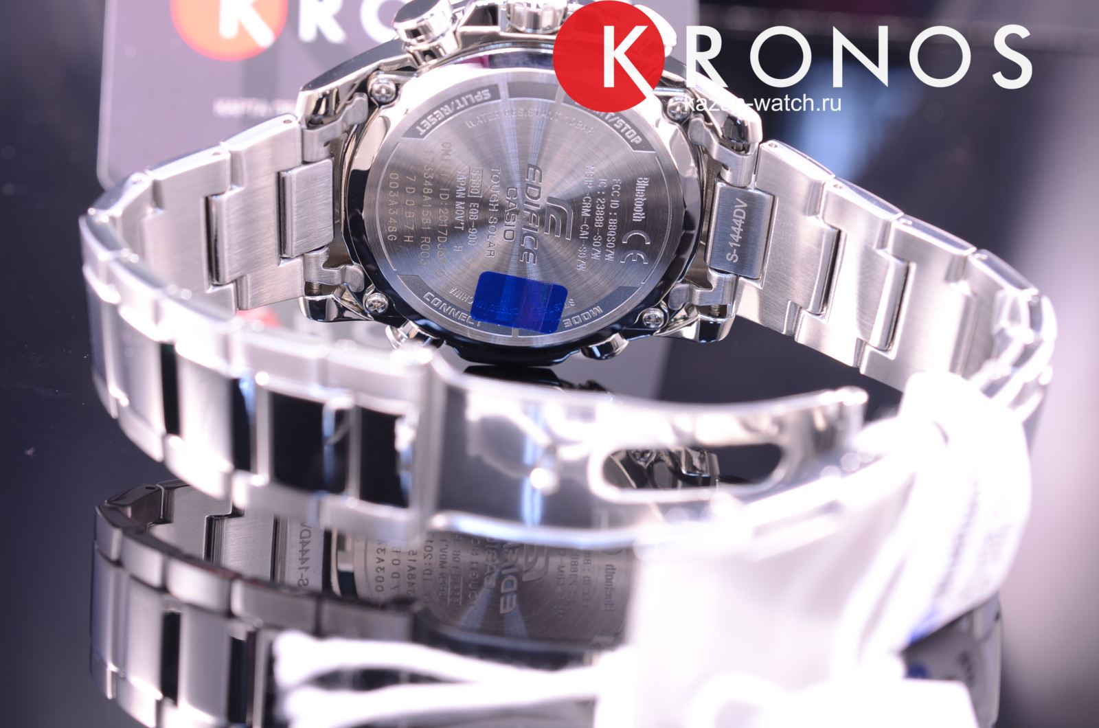 Edifice Bluetooth. Питание от солнечной энергии Tough Solar - солнечные батарейки большой мощности, индикатор заряда батареи. Функция автоматического сохранения энергии. Время работы аккумулятора без подзарядки до 5 месяцев, при включенной функции сохранения энергии до 22 месяцев. Циферблат подсвечивается ярким светодиодом. Светонакопительное покрытие необрит продолжает светиться в темноте даже после непродолжительного пребывания на свету. Беспроводная технология Bluetooth® 4.0 со сверхнизким потреблением энергии для синхронизации со смартфоном. При подключении к смартфону часы корректируют текущее время, а также копируют настройки мирового времени. Второй часовой пояс. Секундомер с точностью показаний 1с и временем измерения 24ч. Сплит-хронограф. Тахиметр. Таймер обратного отсчета от 1мин до 24ч. Ретроградный указатель дня недели. Звуковой сигнал - в установленное время издается тональный сигнал. Завинчивающаяся заводная головка с защитой. Раскладывающаяся застежка, расстегиваемая одним касанием.