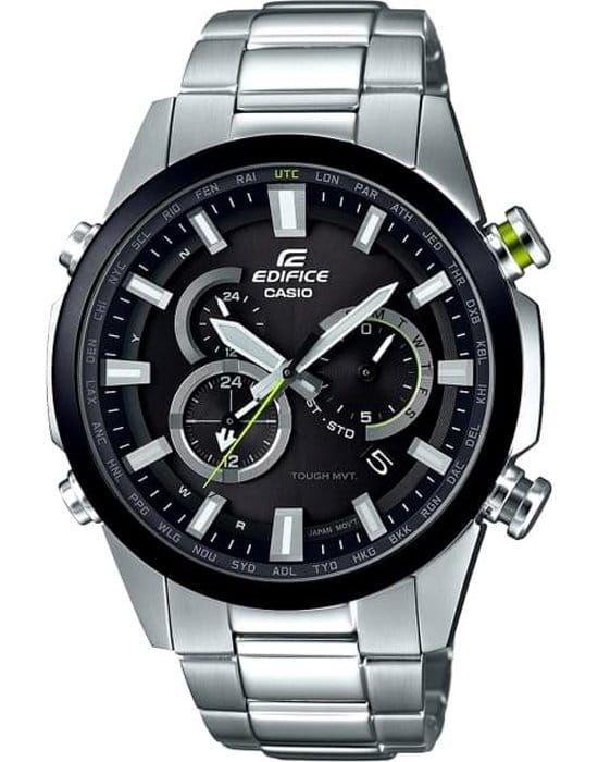 Мужские японские часы Casio Edifice EQW-T640DB-1A из спортивной коллекции Edifice привлекают автомобильным исполнением и полезными дополнительными возможностями.