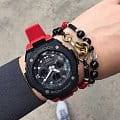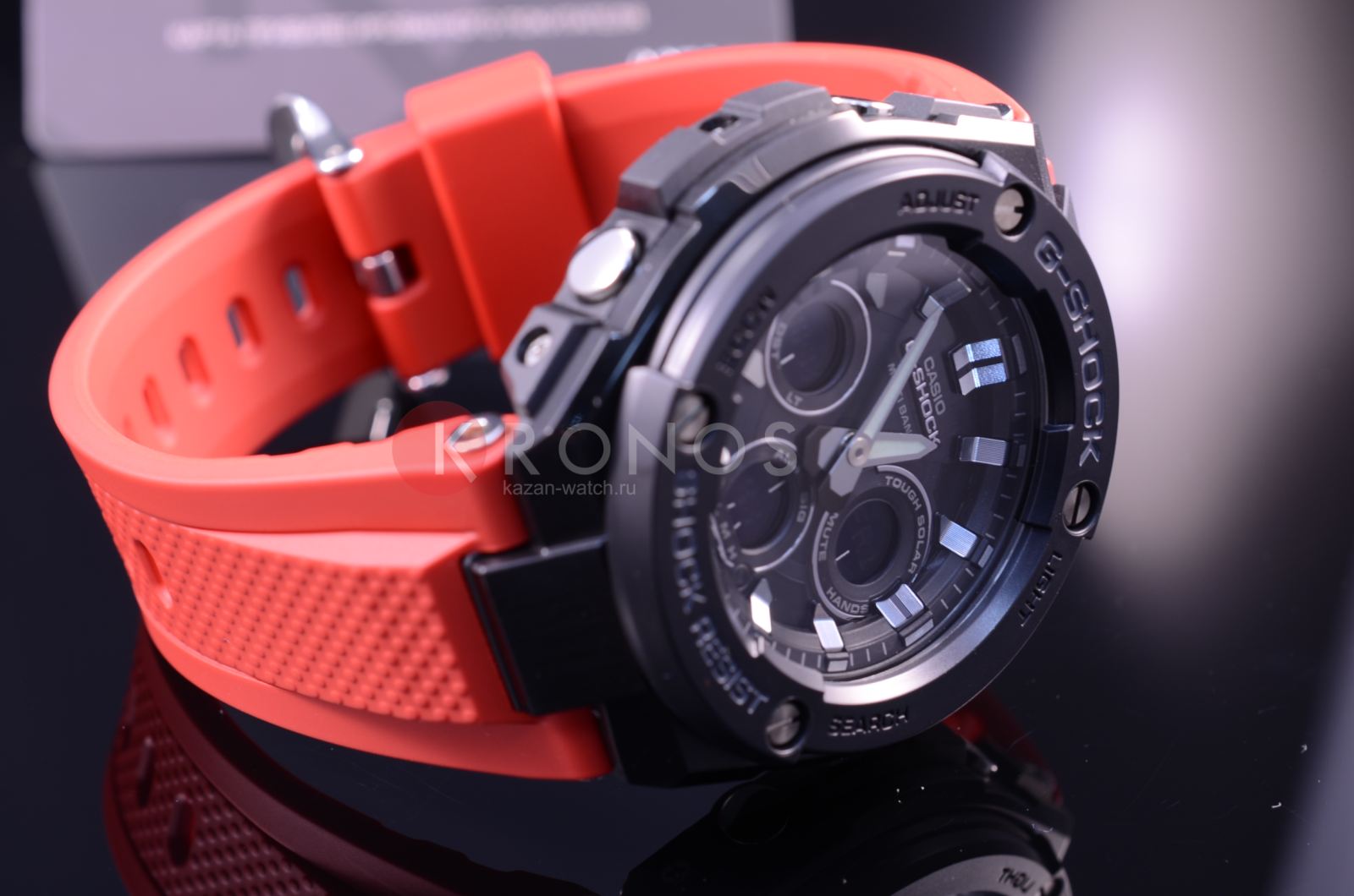 Брендовая модель серии G-Steel представлена в оригинальном исполнении, дизайнеры акцентировали внимание на внушительном безелеБезельВнешний ободок, закрепляющий стекло. В спортивных часах так называется поворотное кольцо с делениями на циферблате, выполняет роль таймера – замеряет отрезки времени на шкале. Неподвижный безель – элемент декора. Однонаправленно вращающийся безель на дайверских часах позволяет фиксировать моменты погружения и выныривания на поверхность. с IP-покрытиемIP-покрытиеМетод ионного напыления. Демонстрирует повышенную устойчивость к истиранию, окислению и химическим веществам. Под воздействием высокого давления и температуры около 1500°C молекулы металла надёжно соединяются с частицами корпуса часов.. Стильным дополнением стал красный каучуковый ремешок, обеспечивающий комфортное ношение. Это часы на солнечной батарее , позволяющие забыть о необходимости завода. Люминесцентная подсветкаЛюминесцентное покрытиеПозволяет считывать показания времени в темноте. Производители наносят на стрелки, часовые индексы, безель или поверхность циферблата светонакопительный состав, дающий холодное свечение. стрелок, яркая светодиодная подсветкаСветодиодная подсветкаСветодиодная или LED-подсветка обеспечивает появление яркого холодного свечения за счёт LED-элементов - маленьких лампочек. Они потребляют минимальное количество энергии, чаще всего можно встретить 1 светодиод, в нижней части циферблата. дисплея. Ударопрочный корпусУдаропрочный корпусМеханизм заключён в корпус, выполненный из современных материалов, устойчивых к ударам, механическим повреждениям и падению с высоты: инновационный пластик, карбон, нержавеющая сталь, титан. из пластика и хирургической стали 316L. Водостойкость 20 бар. Таймер, секундомер, будильник, мировое времяМировое время Полезное часовое усложнение, отображающее время в основных городах и известных областях по всему миру, оно связано с часовыми поясами, удобно для путешественников и бизнесменов. , автоматический календарь, приём радиосигнала для корректировки времени, хронографХронографФункция позволяет измерять отрезки времени с особой точностью: часы, минуты, секунды. Верным признаком хронографа является наличие на циферблате 3 дополнительных окошек-счётчиков.. Габариты: 55,9 x 49,3 x 15,3 мм.