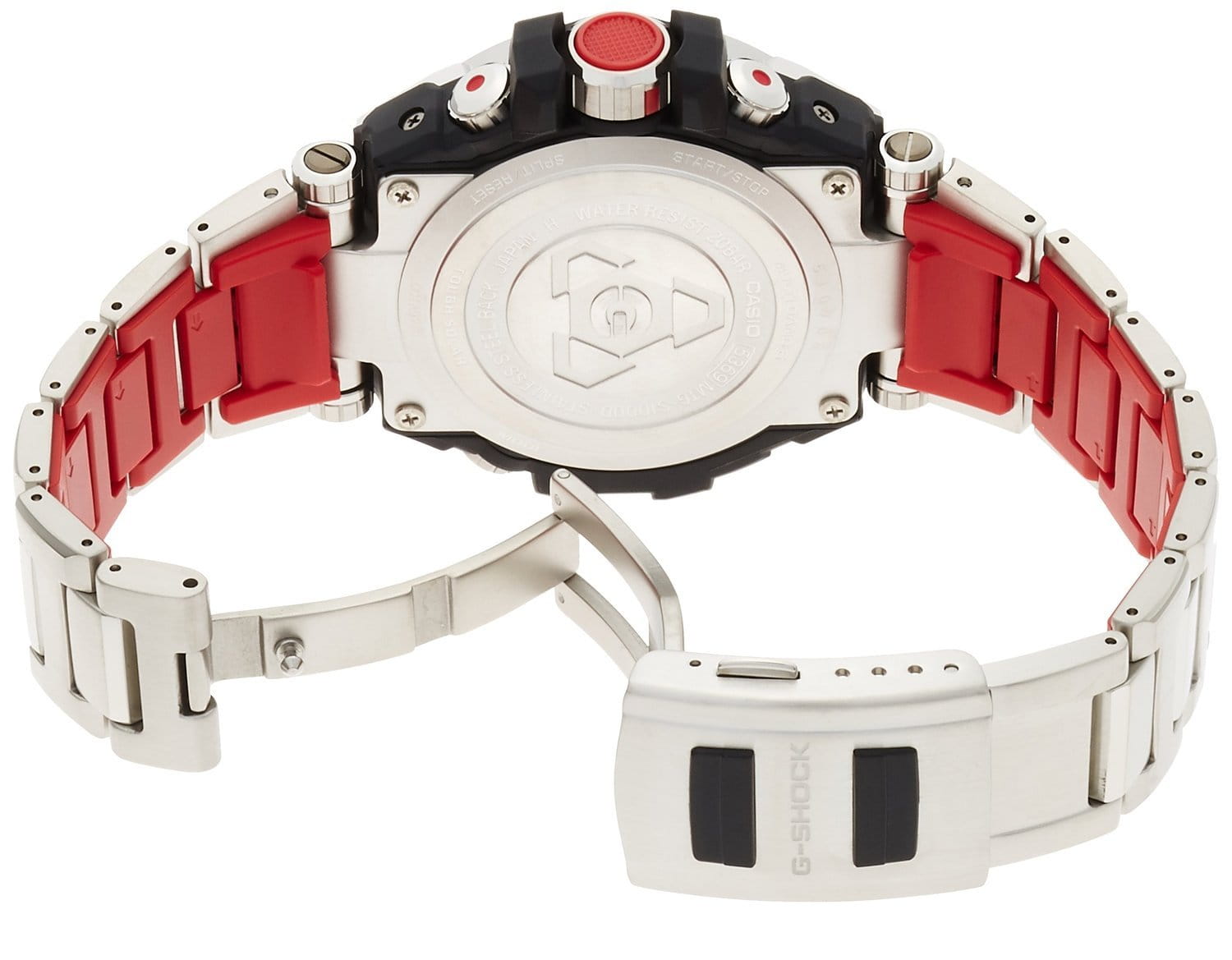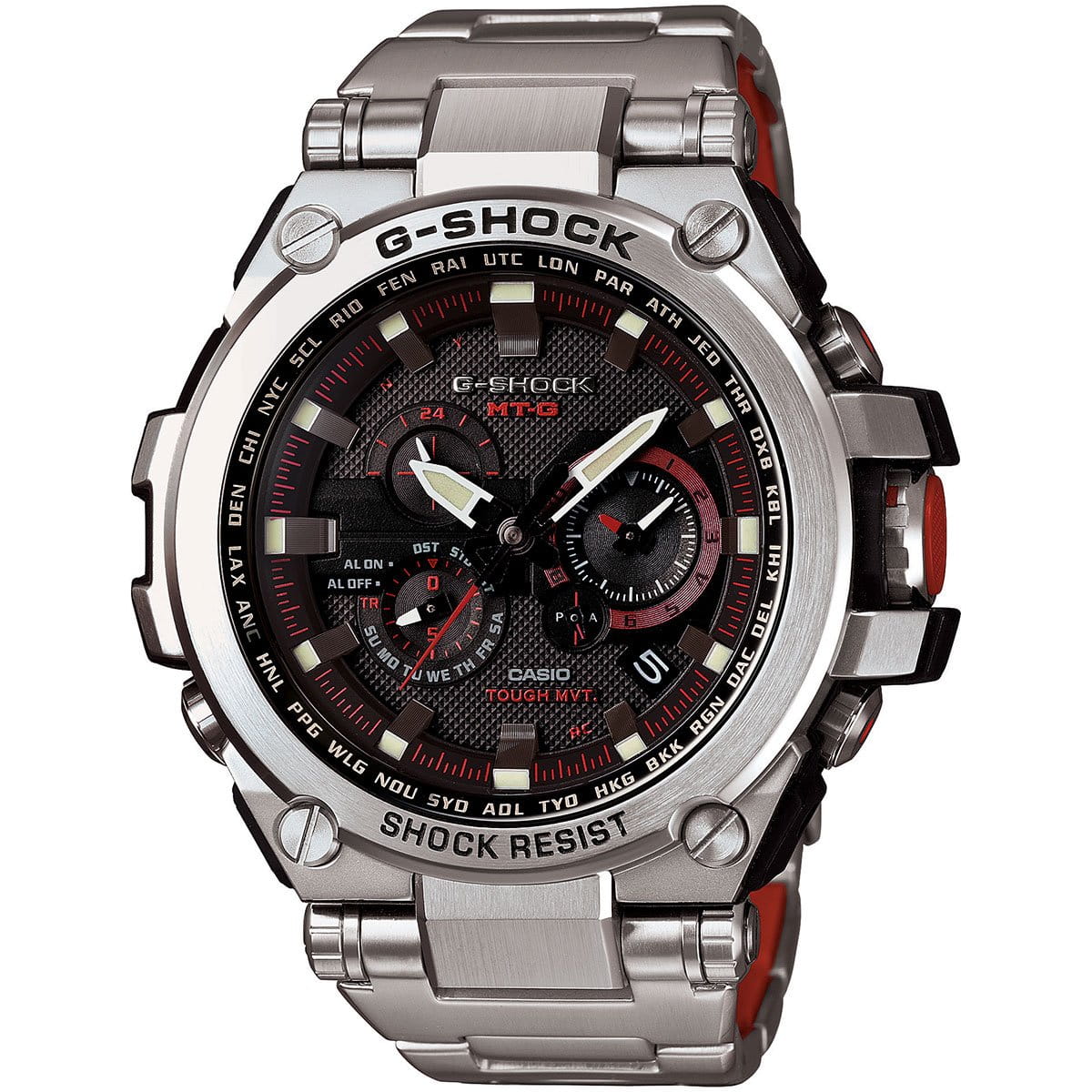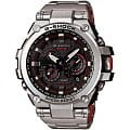 Современные мужские японские наручные часы. Премиум коллекция G-shock MT-G. Корпус и браслет выполнены из высокопрочной стали с аникоррозийными свойствами с пластиковыми вставками. Черный фон циферблата разбавлен объемными светлыми 3D индексами и красными элементами дизайна. Сапфировое стекло с антибликовым покрытием, устойчивое к появлению царапин. Часы снабжены множеством дополнительных функций - секундомер, полностью автоматическая подсветка с автоматической регулируемой автоматизацией. Ежечасный сигнал, повтор сигнала будильника, второй часовой пояс. Водонепроницаемость часов до 200 метров (возможны занятия дайвингом). Ударопрочные и магнитоустойчивые, источник энергии солнечная батарея.