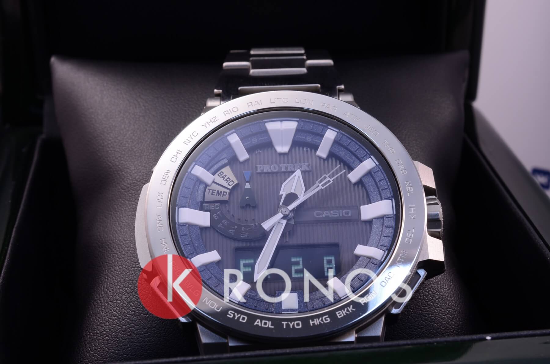 PRX-8000GT-7PR - модель, которая на сегодняшний день считается одной из лучших для занятий профессиональным альпинизмом Сверхнадежные часы отличаются не только премиальным дизайном, богатым набором функций, но и превосходной считываемостью информации, поэтому спокойно могут быть использованы альпинистами даже на высоте 8 километров Самые ключевые детали корпуса этой модели выполнены из высокопрочного сплава титана, который для дополнительной стойкости покрыт слоем карбида титана Корона часов, безель и все кнопки обработаны покрытием DLC (углеродное алмазное вещество) Циферблат со стрелками с двойной люминесцентной обработкой для лучшей видимости в темноте покрыт сверхпрочным сапфировым стеклом PRX-8000GT-7PR имеют максимальную защиту, поэтому не боятся ни ударов, ни вибрации, ни погружения в воду (до 100 метров), ни перепадов температур (до -10°C), да и трудно найти что-то такое, что могло бы их сильно повредить Конечно, при желании можно разбить любые защищенные часы, но в альпинизме, где всякое случается, модель PRX-8000T – это самый надежный помощник, который точно не подведет
