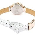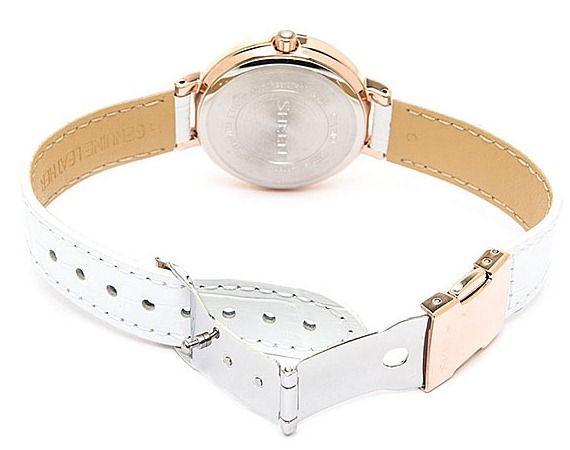 Стильные женские наручные часы, выполненные в fashion стиле. Кварцевые часы с элементом питания SR920SW. Корпус часов выполнен из высокопрочной стали с полным IP покрытием золотого цвета. Золотые индексы и стрелки на светлом циферблате. Водонепроницаемость часов 50 метров, минеральное стекло, устойчивое к царапинам. Украшены часы кристаллами Swarovski. Ремешок из натуральной кожи белого цвета прочно удерживает часы на руке.
