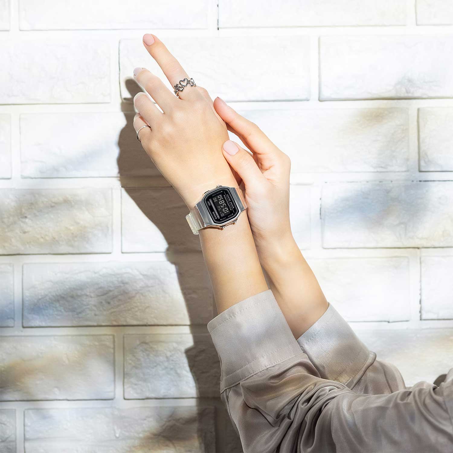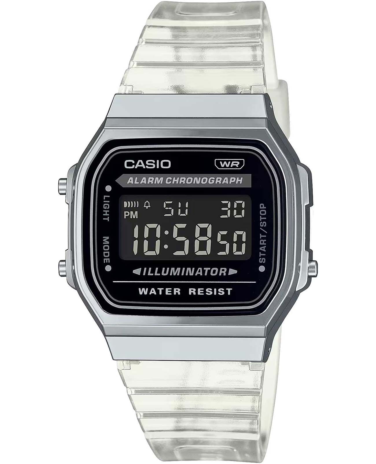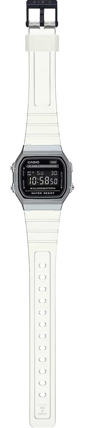 Винтажные японские часы Casio Vintage A168XES-1BDF. Корпус часов выполнен из пластика. Прозрачный силиконовый ремешок на стандартной застёжке. Автоматический вечный календарьВечный календарьКлассическое часовое усложнение, представляющее собой календарь, рассчитанный на несколько лет вперёд (стандартно – до 2099 года). Определяет текущую дату, день недели, месяц.. 12 и 24-часовой формат времени. Акриловое стекло. БудильникБудильникБуди́льник — часы, в заданный момент времени подающие звуковой, световой и/или в редких случаях другой сигнал., таймерТаймерОтсчитывает секунды в обратном направлении в заданном интервале времени., секундомерСекундомерСекундоме́р — прибор, способный измерять интервалы времени с точностью до долей секунды.. Электролюминесцентная подсветкаЭлектролюминесцентная подсветкаЭлектролюминесцентная панель устанавливается под ЖК-экраном часов, при нажатии кнопки электричество преобразуется в свет за счёт подачи напряжения на атомы фосфора, такой тип подсветки позволяет освещать весь циферблат. циферблата. Класс водозащиты: 30 метров, позволит защитить корпус от случайных брызг или капель дождя.