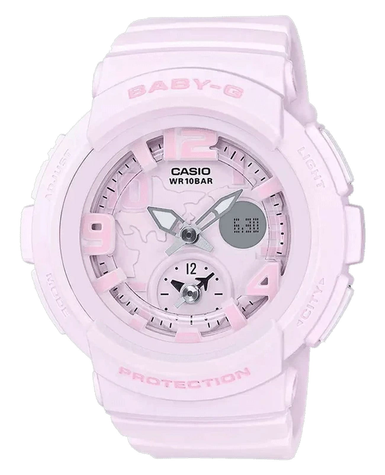 Японские женские часы-хронографХронографФункция позволяет измерять отрезки времени с особой точностью: часы, минуты, секунды. Верным признаком хронографа является наличие на циферблате 3 дополнительных окошек-счётчиков. Casio Baby-G BGA-190BC-4BDR из коллекции Baby-G. Минеральное стеклоМинеральное стеклоМинеральное стекло представляет собой искусственно выращенный минерал кварца. Такое стекло отличается особой устойчивостью к повреждениям и царапинам. Уступает по некоторым качествам сапфировому стеклу. устойчивое к появлению царапин, обладающее высокой прозрачностью. Корпус часов изготовлен из полимерного материала. Светодиодная подсветкаСветодиодная подсветкаСветодиодная или LED-подсветка обеспечивает появление яркого холодного свечения за счёт LED-элементов - маленьких лампочек. Они потребляют минимальное количество энергии, чаще всего можно встретить 1 светодиод, в нижней части циферблата. с функцией послесвечения. Ударопрочный корпусУдаропрочный корпусМеханизм заключён в корпус, выполненный из современных материалов, устойчивых к ударам, механическим повреждениям и падению с высоты: инновационный пластик, карбон, нержавеющая сталь, титан. защищает механизм от ударов и вибрации. Функция Мирового времениМировое время Полезное часовое усложнение, отображающее время в основных городах и известных областях по всему миру, оно связано с часовыми поясами, удобно для путешественников и бизнесменов. и летнего времени, второй часовой пояс. СекундомерСекундомерСекундоме́р — прибор, способный измерять интервалы времени с точностью до долей секунды. с точностью измерения 1/100 секунды и измерением до 23 часов 59 минут 59,99 cек. ТаймерТаймерОтсчитывает секунды в обратном направлении в заданном интервале времени. обратного отсчета (диапазон времени 24 часа), автоматический календарь, 12/24 отображение времени. 5 ежедневных будильниковБудильникБуди́льник — часы, в заданный момент времени подающие звуковой, световой и/или в редких случаях другой сигнал.. Отображение сведений о приливах и отливах (уровень прилива на ближайшие 12 часов, и на определенную дату и время). Функция включения/отключения звука кнопок. Функция перемещения стрелок. Класс водозащиты: 100 метров, позволит плавать без погружения. Ремешок из полимерного материала на стандартной застежке.