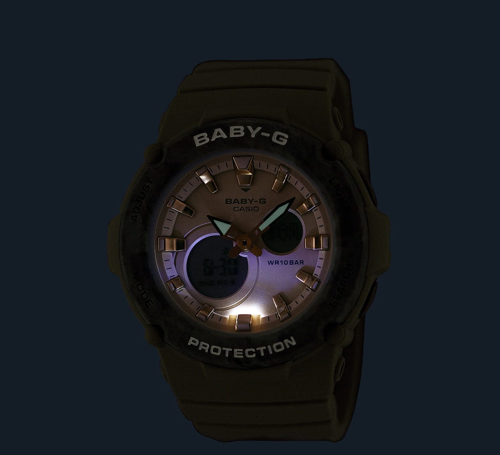 Женские японские наручные часы с противоударнымУдаропрочный корпусМеханизм заключён в корпус, выполненный из современных материалов, устойчивых к ударам, механическим повреждениям и падению с высоты: инновационный пластик, карбон, нержавеющая сталь, титан. корпусом Casio Baby-G BGA-275-3A. Функциональность данной модели: формат времени 12/24, мировое время 48 городов (29 часовых поясов), вечный календарь до 2099 года, функция летнего времени, 5 независимых будильников, сигнал начала часа, секундомерСекундомерСекундоме́р — прибор, способный измерять интервалы времени с точностью до долей секунды. с точностью 1/100 секунды и измерением до 23 часов 59 минут 59,99 cек., таймер обратного отсчета (диапазон времени 24 часа), светодиодная подсветкаСветодиодная подсветкаСветодиодная или LED-подсветка обеспечивает появление яркого холодного свечения за счёт LED-элементов - маленьких лампочек. Они потребляют минимальное количество энергии, чаще всего можно встретить 1 светодиод, в нижней части циферблата. циферблата с функцией послесвечения, функция выключения звука нажатия кнопок. Стрелки покрыты необритовым (NeobriteПодсветка NeobriteИспользование светонакопительных составов на основе сульфида цинка или алюмината стронция, яркий свет можно наблюдать на протяжении 6-10 часов после «зарядки» часов около источника света.) люминесцентнымЛюминесцентное покрытиеПозволяет считывать показания времени в темноте. Производители наносят на стрелки, часовые индексы, безель или поверхность циферблата светонакопительный состав, дающий холодное свечение. напылением (светятся в темноте).
