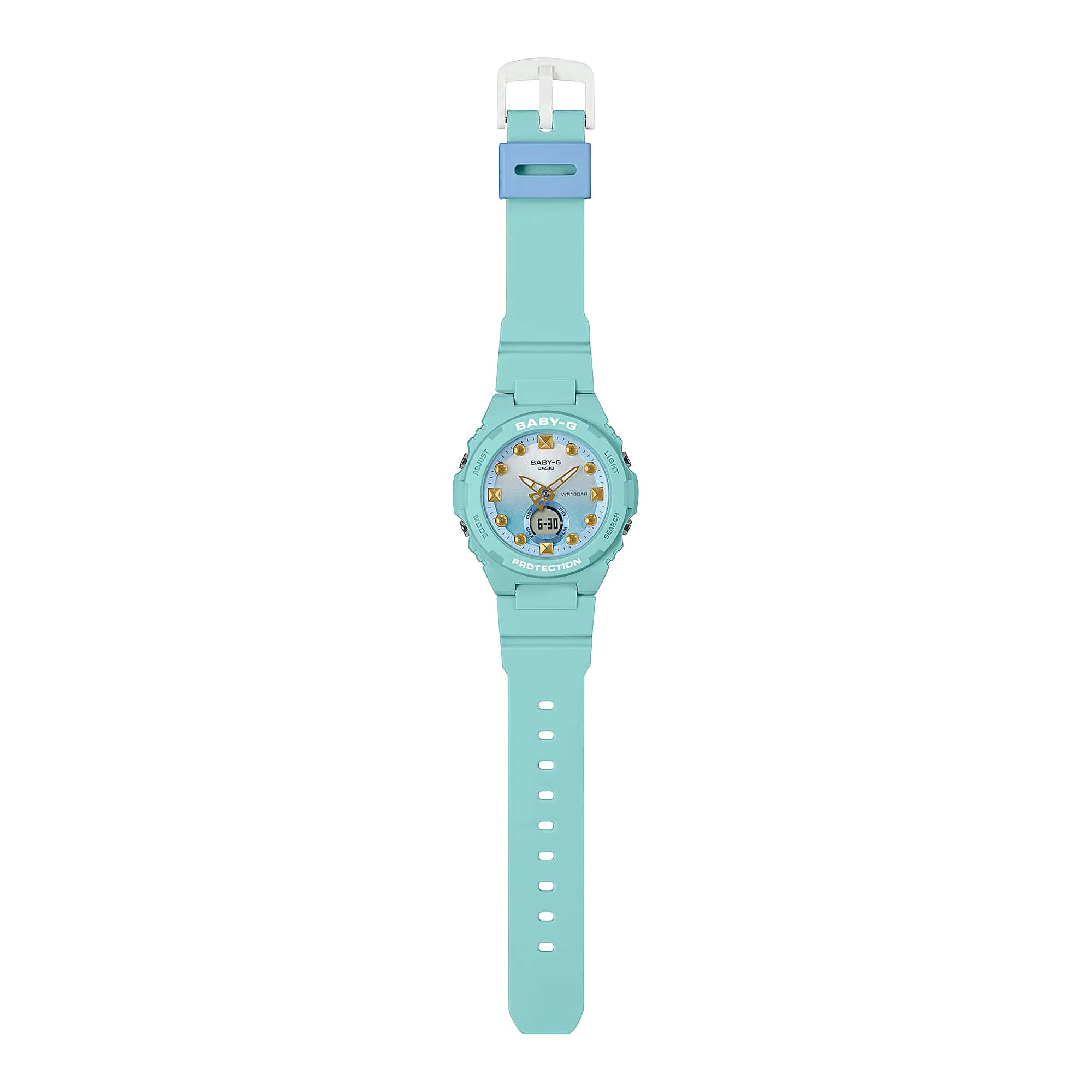 Женские противоударные японские наручные часы Casio Baby-G BGA-320-3A, кварцевый механизм с высокой точностью. Класс водозащиты: 100 метров, позволит плавать, нырять и заниматься другими водными видами спорта. Корпус часов изготовлен из пластика. Ударопрочный корпусУдаропрочный корпусМеханизм заключён в корпус, выполненный из современных материалов, устойчивых к ударам, механическим повреждениям и падению с высоты: инновационный пластик, карбон, нержавеющая сталь, титан. защищает механизм от ударов и вибрации. Пластиковый ремешок на стандартной застёжке. Японский кварцевый механизм работает от аккумулятора, рассчитанного на 3 года работы. Минеральное стеклоМинеральное стеклоМинеральное стекло представляет собой искусственно выращенный минерал кварца. Такое стекло отличается особой устойчивостью к повреждениям и царапинам. Уступает по некоторым качествам сапфировому стеклу. устойчивое к мелким механическим повреждениям. Светодиодная подсветкаСветодиодная подсветкаСветодиодная или LED-подсветка обеспечивает появление яркого холодного свечения за счёт LED-элементов - маленьких лампочек. Они потребляют минимальное количество энергии, чаще всего можно встретить 1 светодиод, в нижней части циферблата. освещает весь циферблат, после отпускания кнопки свечение продолжается еще некоторое время. Функция секундомераСекундомерСекундоме́р — прибор, способный измерять интервалы времени с точностью до долей секунды. с точностью измерения 1/100 секунды и измерением до 23 часов 59 минут 59,99 cек. ТаймерТаймерОтсчитывает секунды в обратном направлении в заданном интервале времени. обратного отсчета (диапазон времени 24 часа). 5 ежедневных будильниковБудильникБуди́льник — часы, в заданный момент времени подающие звуковой, световой и/или в редких случаях другой сигнал.. Автоматический календарь. Функция мирового времениМировое время Полезное часовое усложнение, отображающее время в основных городах и известных областях по всему миру, оно связано с часовыми поясами, удобно для путешественников и бизнесменов. 30 городов (29 часовых поясов).