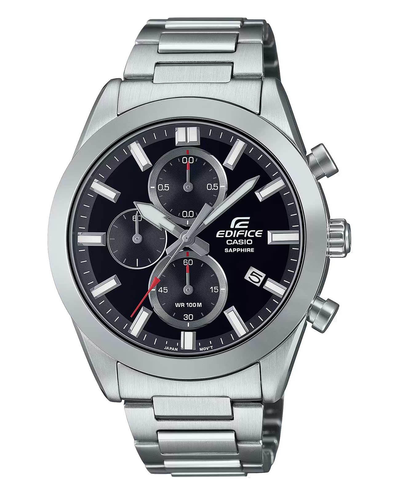 Мужские часы-хронографХронографФункция позволяет измерять отрезки времени с особой точностью: часы, минуты, секунды. Верным признаком хронографа является наличие на циферблате 3 дополнительных окошек-счётчиков.  Casio Edifice EFB-710D-1A, кварцевый механизм с высокой точностью. Минеральное стеклоМинеральное стеклоМинеральное стекло представляет собой искусственно выращенный минерал кварца. Такое стекло отличается особой устойчивостью к повреждениям и царапинам. Уступает по некоторым качествам сапфировому стеклу. устойчивое к появлению царапин, обладающее высокой прозрачностью. СекундомерСекундомерСекундоме́р — прибор, способный измерять интервалы времени с точностью до долей секунды. с точностью показаний 1/10с и временем измерения 1ч. Корпус изготовлен из нержавеющей стали. Стрелки и метки с люминесцентным покрытиемЛюминесцентное покрытиеПозволяет считывать показания времени в темноте. Производители наносят на стрелки, часовые индексы, безель или поверхность циферблата светонакопительный состав, дающий холодное свечение.. На циферблате находится три дополнительных  индикатора. Окошко даты находится в положении 4 часов. Класс водозащиты: 100 метров, позволит плавать, нырять и заниматься другими водными видами спорта. Заводная головка с защитой. Стальной браслет на раскладной застёжкеРаскладная застёжкаТакой тип застёжки используется только на браслетах из металла. Она никогда не раскрывается полностью, происходит разделение на 2 и более частей. Раскладывающая застёжка снизит вероятность потери часов к минимуму..