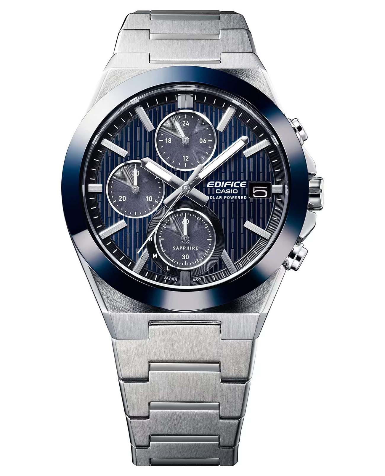 Мужские кварцевые часы Casio из коллекции Edifice — это первая модель в серии с керамическим безелем, сочетающая изысканность и высокую прочность. Корпус размером 40,9×46,7 мм и толщиной 11,7 мм выполнен из нержавеющей стали 316L. БезельБезельВнешний ободок, закрепляющий стекло. В спортивных часах так называется поворотное кольцо с делениями на циферблате, выполняет роль таймера – замеряет отрезки времени на шкале. Неподвижный безель – элемент декора. Однонаправленно вращающийся безель на дайверских часах позволяет фиксировать моменты погружения и выныривания на поверхность. изготовлен из высокотехнологичной керамики, устойчивой к царапинам, что придаёт изделию премиальный вид и повышенную долговечность. Циферблат синего цвета оформлен штрихами и субциферблатами хронографа. Окошко даты расположено в положении 3 часов. Циферблат защищён сапфировым стекломСапфировое стеклоПрочный и надёжный материал из кристалла сапфира синтетического происхождения, характеризующийся особой твёрдостью и устойчивостью к царапинам и повреждениям. с антибликовым покрытиемАнтибликовое покрытиеСлой оксида металла в 0,13-0,3 микрон, благодаря которому стекло часов не бликует и не отражает свет. Антибликовое покрытие уменьшает отражение света в 10 раз, обеспечивая отличную читаемость показателей циферблата.. Механизм работает от солнечной энергии (Tough SolarTough SolarТехнология основана на подзарядке аккумулятора от источника солнечного света, специальная панель улавливает солнечные лучи и преобразует их в энергию для работы часов. Достаточно пары минут нахождения на солнце для функционирования часов в течении суток.) с индикацией заряда батареи и обеспечивает до 5 месяцев автономной работы без подзарядки. Часы оснащены функциями хронографаХронографФункция позволяет измерять отрезки времени с особой точностью: часы, минуты, секунды. Верным признаком хронографа является наличие на циферблате 3 дополнительных окошек-счётчиков. и секундомераСекундомерСекундоме́р — прибор, способный измерять интервалы времени с точностью до долей секунды., а также 12/24-часовым форматом времени. Часы оснащены литым стальным браслетом на тройной раскладной застёжкеРаскладная застёжкаТакой тип застёжки используется только на браслетах из металла. Она никогда не раскрывается полностью, происходит разделение на 2 и более частей. Раскладывающая застёжка снизит вероятность потери часов к минимуму. с быстрым открытием. Водонепроницаемость 100 м позволяет использовать часы для плавания и повседневного ношения. Идеальный выбор для тех, кто ценит технологии, стиль и надёжность.