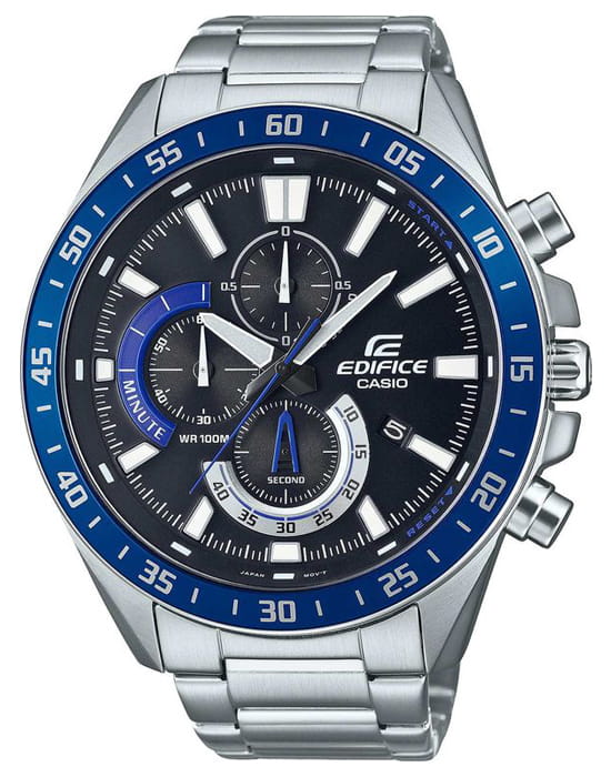 Японские мужские часы-хронографХронографФункция позволяет измерять отрезки времени с особой точностью: часы, минуты, секунды. Верным признаком хронографа является наличие на циферблате 3 дополнительных окошек-счётчиков. Casio Edifice EFV-620D-1A2V. Минеральное стеклоМинеральное стеклоМинеральное стекло представляет собой искусственно выращенный минерал кварца. Такое стекло отличается особой устойчивостью к повреждениям и царапинам. Уступает по некоторым качествам сапфировому стеклу. устойчивое к появлению царапин, обладающее высокой прозрачностью. Копрус часов изготовлен из нержавеющей стали. БезельБезельВнешний ободок, закрепляющий стекло. В спортивных часах так называется поворотное кольцо с делениями на циферблате, выполняет роль таймера – замеряет отрезки времени на шкале. Неподвижный безель – элемент декора. Однонаправленно вращающийся безель на дайверских часах позволяет фиксировать моменты погружения и выныривания на поверхность. из стали с IP-покрытиемIP-покрытиеМетод ионного напыления. Демонстрирует повышенную устойчивость к истиранию, окислению и химическим веществам. Под воздействием высокого давления и температуры около 1500°C молекулы металла надёжно соединяются с частицами корпуса часов.. Светодиодная автоподсветка NeobriteПодсветка NeobriteИспользование светонакопительных составов на основе сульфида цинка или алюмината стронция, яркий свет можно наблюдать на протяжении 6-10 часов после «зарядки» часов около источника света. - при повороте часов в сторону лица подсветка дисплея осуществляется автоматически. Настраиваемое послесвечение 1,5 или 3сек. Записная книжка на 30 ячеек памяти для записи имен и телефонных номеров, каждая запись может включать в себя текст из 8 букв и 16 цифр. СекундомерСекундомерСекундоме́р — прибор, способный измерять интервалы времени с точностью до долей секунды. с точностью измерения 1/100 секунды и измерением до 23 часов 59 минут 59,99 cек. ТаймерТаймерОтсчитывает секунды в обратном направлении в заданном интервале времени. обратного отсчета (диапазон времени 24 часа), автоматический календарь, 12/24 отображение времени. Мировое времяМировое время Полезное часовое усложнение, отображающее время в основных городах и известных областях по всему миру, оно связано с часовыми поясами, удобно для путешественников и бизнесменов. – 30 городов (29 часовых поясов). 5 будильниковБудильникБуди́льник — часы, в заданный момент времени подающие звуковой, световой и/или в редких случаях другой сигнал., один с функцией Snooze, ежечасный сигнал. Класс водозащиты: 100 метров, позволит плавать, нырять и заниматься другими водными видами спорта. Стальной браслет на раскладной застёжкеРаскладная застёжкаТакой тип застёжки используется только на браслетах из металла. Она никогда не раскрывается полностью, происходит разделение на 2 и более частей. Раскладывающая застёжка снизит вероятность потери часов к минимуму..
