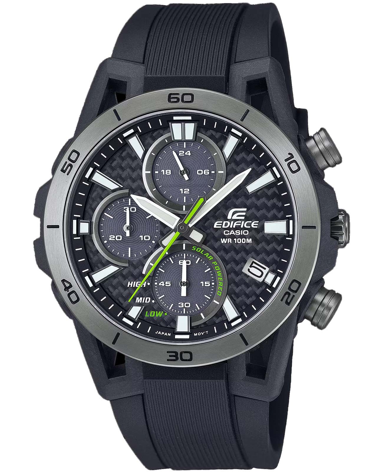 Редкая лимитированная модель — супер стильный хронограф Edifice 2024 года из серии EQS-960 в полностью черном усиленном карбоном корпусе с контрастными стрелками и метками циферблата и с яркой красной секундной стрелкой. Модуль часов надежно защищен минеральным стеклом и стальным безелем.