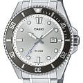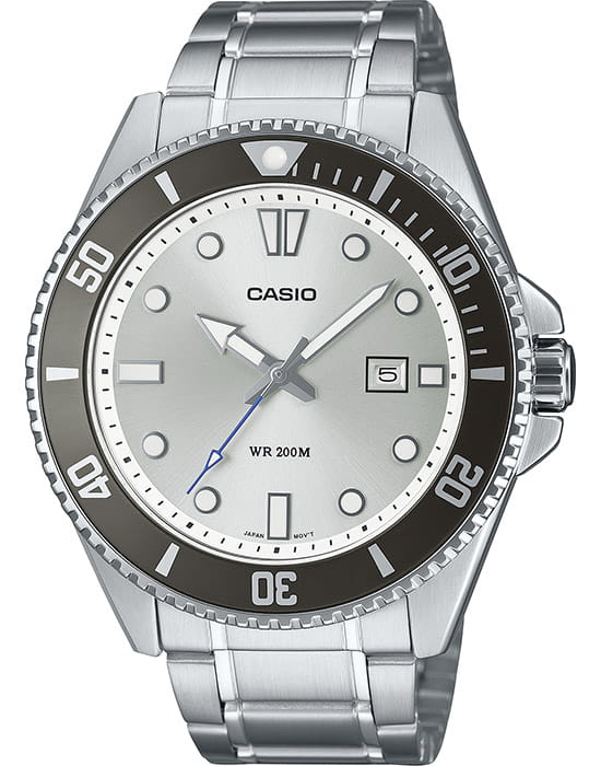 Японские мужские кварцевые часы с минеральным стекломМинеральное стеклоМинеральное стекло представляет собой искусственно выращенный минерал кварца. Такое стекло отличается особой устойчивостью к повреждениям и царапинам. Уступает по некоторым качествам сапфировому стеклу. Casio Collection MDV-107D-7A, кварцевый механизм с высокой точностью. Корпус часов изготовлен из нержавеющей стали. Вращающийся безельБезельВнешний ободок, закрепляющий стекло. В спортивных часах так называется поворотное кольцо с делениями на циферблате, выполняет роль таймера – замеряет отрезки времени на шкале. Неподвижный безель – элемент декора. Однонаправленно вращающийся безель на дайверских часах позволяет фиксировать моменты погружения и выныривания на поверхность. из нержавеющей стали с IP-покрытиемIP-покрытиеМетод ионного напыления. Демонстрирует повышенную устойчивость к истиранию, окислению и химическим веществам. Под воздействием высокого давления и температуры около 1500°C молекулы металла надёжно соединяются с частицами корпуса часов.. Подсветка NeobriteПодсветка NeobriteИспользование светонакопительных составов на основе сульфида цинка или алюмината стронция, яркий свет можно наблюдать на протяжении 6-10 часов после «зарядки» часов около источника света. обеспечивает длительное послесвечение в темноте даже после кратковременного нахождения на свету. Окошко даты находится в положении 3 часа. Класс водозащиты: 200 метров, позволит плавать, нырять и заниматься другими водными видами спорта. Стальной браслет на раскладной застежке