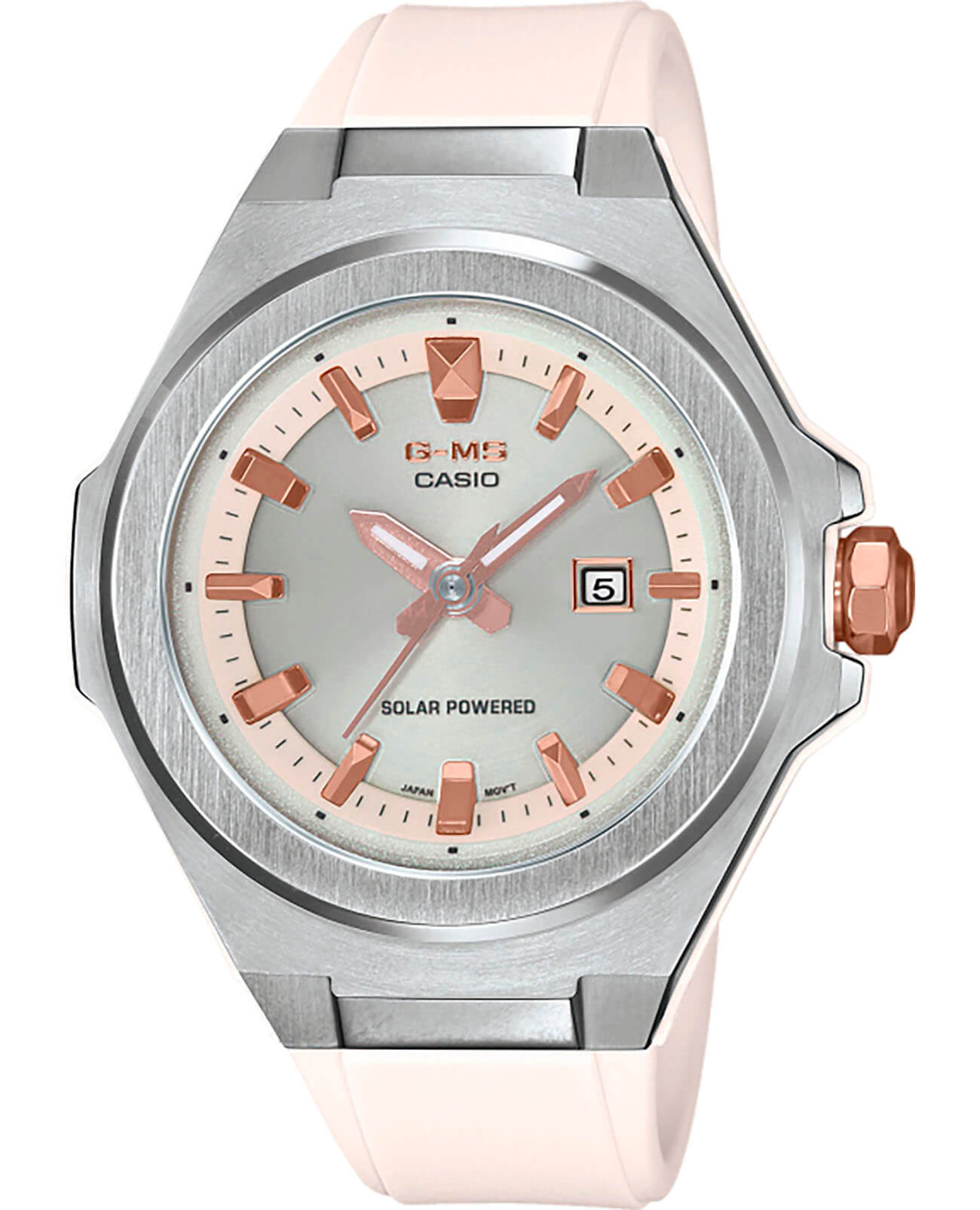 Женские японские часы Casio Baby-G MSG-S500-7AER из коллекции Baby-G стали отражением спортивного дизайна с элементами в стиле fashion. Модель сочетает несколько вариаций розового: металлизированные стрелки, индексы, заводная головка, пастельный оттенок полимерного ремешка. Такое исполнение поможет девушкам, ведущим активный образ жизни, не забывать о своей женственной натуре. Наручные часы реализуют технологию Tough SolarTough SolarТехнология основана на подзарядке аккумулятора от источника солнечного света, специальная панель улавливает солнечные лучи и преобразует их в энергию для работы часов. Достаточно пары минут нахождения на солнце для функционирования часов в течении суток., получая питание от солнца и искусственных источников света. При полностью зараженной батарейке японский кварцевый механизм способен проработать до 5 месяцев без подзарядки. Противоударный корпусУдаропрочный корпусМеханизм заключён в корпус, выполненный из современных материалов, устойчивых к ударам, механическим повреждениям и падению с высоты: инновационный пластик, карбон, нержавеющая сталь, титан. сделан из полимерного материала и нержавеющей стали 316L, что позволяет не бояться последствий ударов, падения. Циферблат оснащён минеральным стекломМинеральное стеклоМинеральное стекло представляет собой искусственно выращенный минерал кварца. Такое стекло отличается особой устойчивостью к повреждениям и царапинам. Уступает по некоторым качествам сапфировому стеклу., оно отличается прочностью, устойчивостью к образованию царапин. Завинчивающаяся заводная головка способствует усилению водостойкости до 10 бар. Стрелки покрыты светонакопительным люминесцентным составомЛюминесцентное покрытиеПозволяет считывать показания времени в темноте. Производители наносят на стрелки, часовые индексы, безель или поверхность циферблата светонакопительный состав, дающий холодное свечение.. На позиции 3 часов размещена апертура текущего числа. Габариты: 38,8 x 42,4 x 10,5 мм.