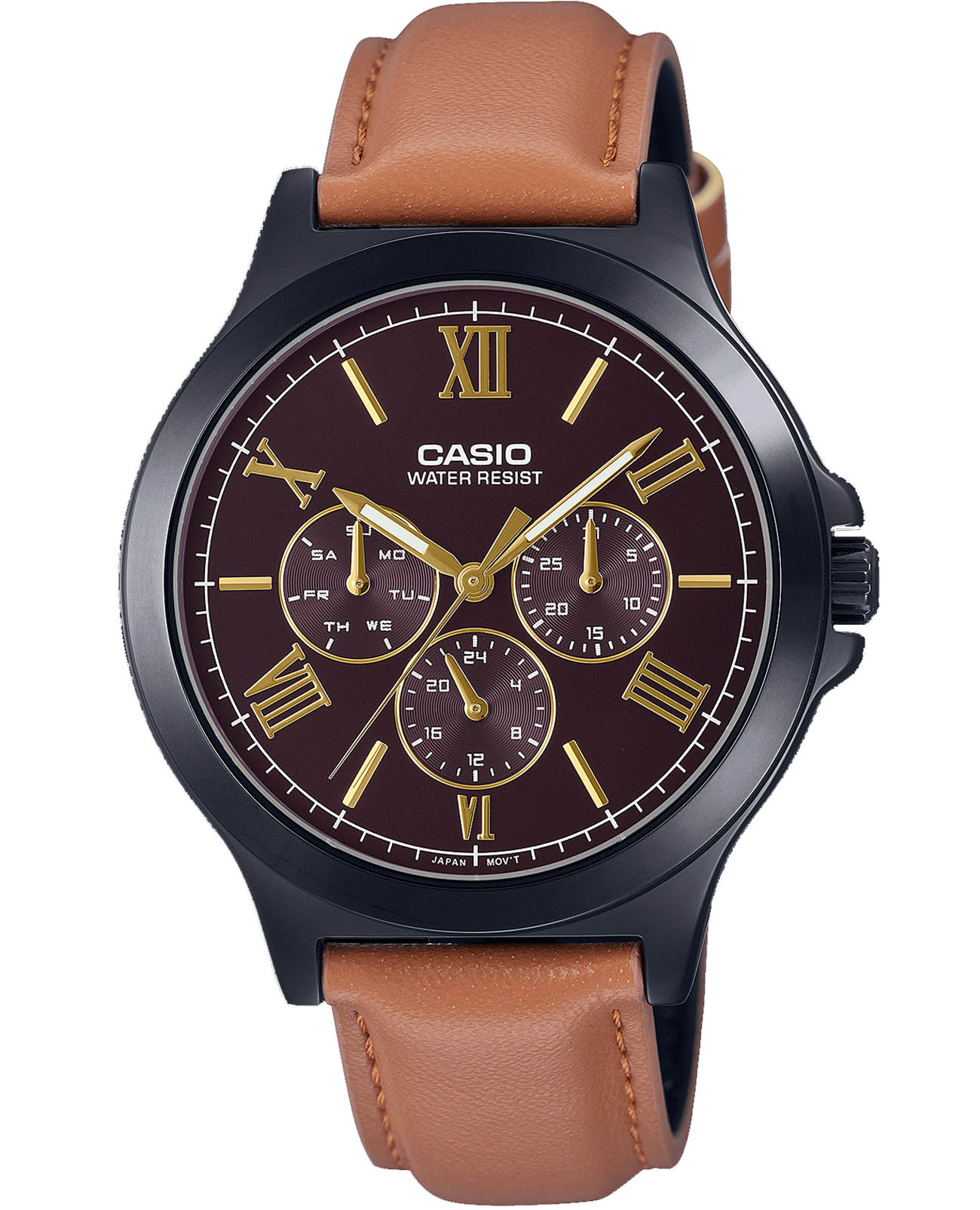Японские мужские часы с минеральным стекломМинеральное стеклоМинеральное стекло представляет собой искусственно выращенный минерал кварца. Такое стекло отличается особой устойчивостью к повреждениям и царапинам. Уступает по некоторым качествам сапфировому стеклу. Casio Collection MTP-V300B-1A, кварцевый механизм с высокой точностью. Корпус часов изготовлены из стали IP-покрытиемIP-покрытиеМетод ионного напыления. Демонстрирует повышенную устойчивость к истиранию, окислению и химическим веществам. Под воздействием высокого давления и температуры около 1500°C молекулы металла надёжно соединяются с частицами корпуса часов.. Люминесцентная подсветкаЛюминесцентное покрытиеПозволяет считывать показания времени в темноте. Производители наносят на стрелки, часовые индексы, безель или поверхность циферблата светонакопительный состав, дающий холодное свечение. стрелок. Кожаный ремешок на стандартной застёжке. Водозащита: 50 метров, позволит защитить корпус от случайных брызг или капель дождя