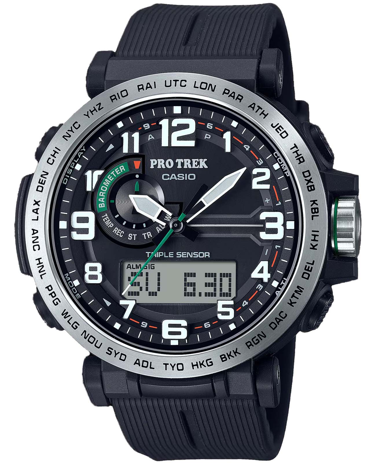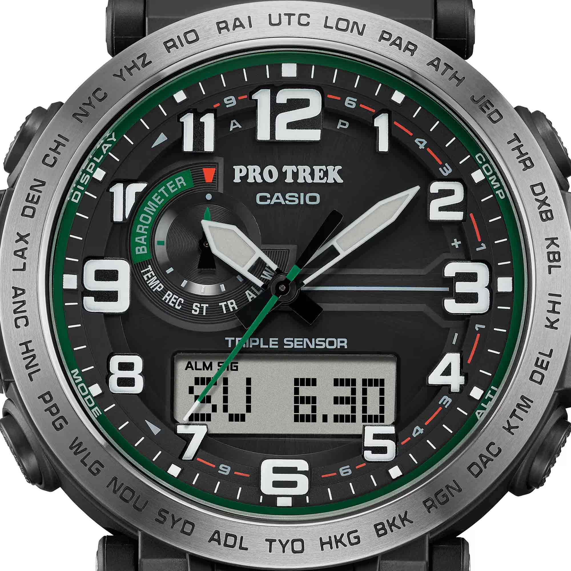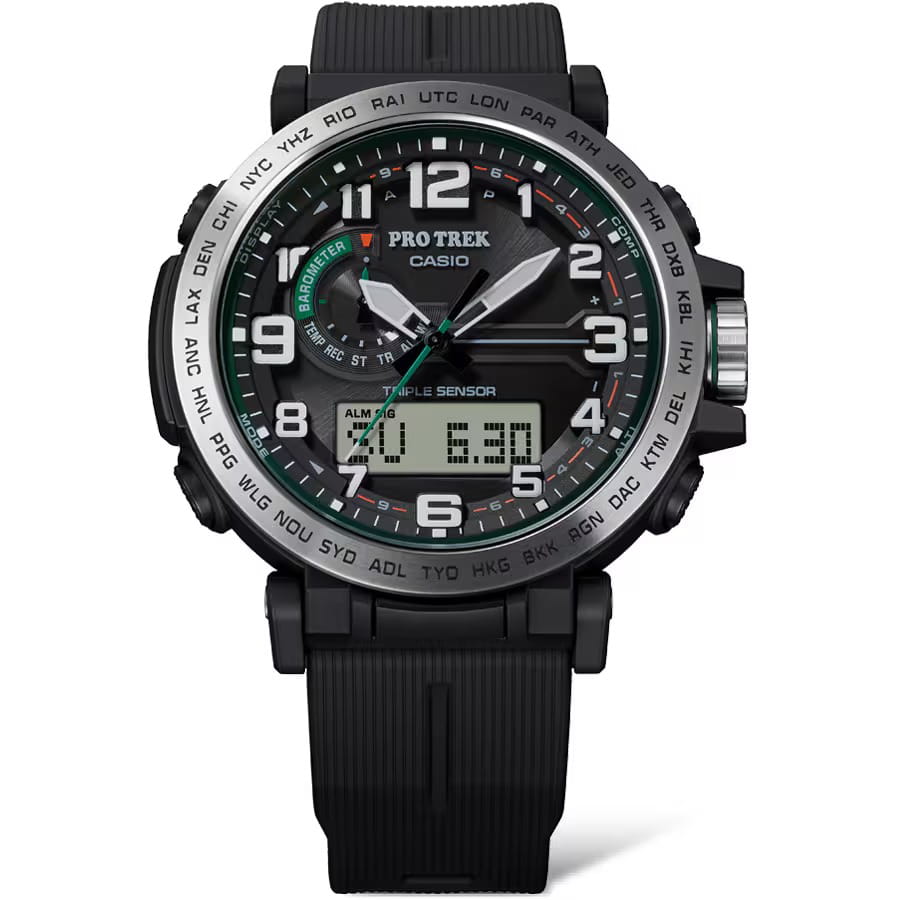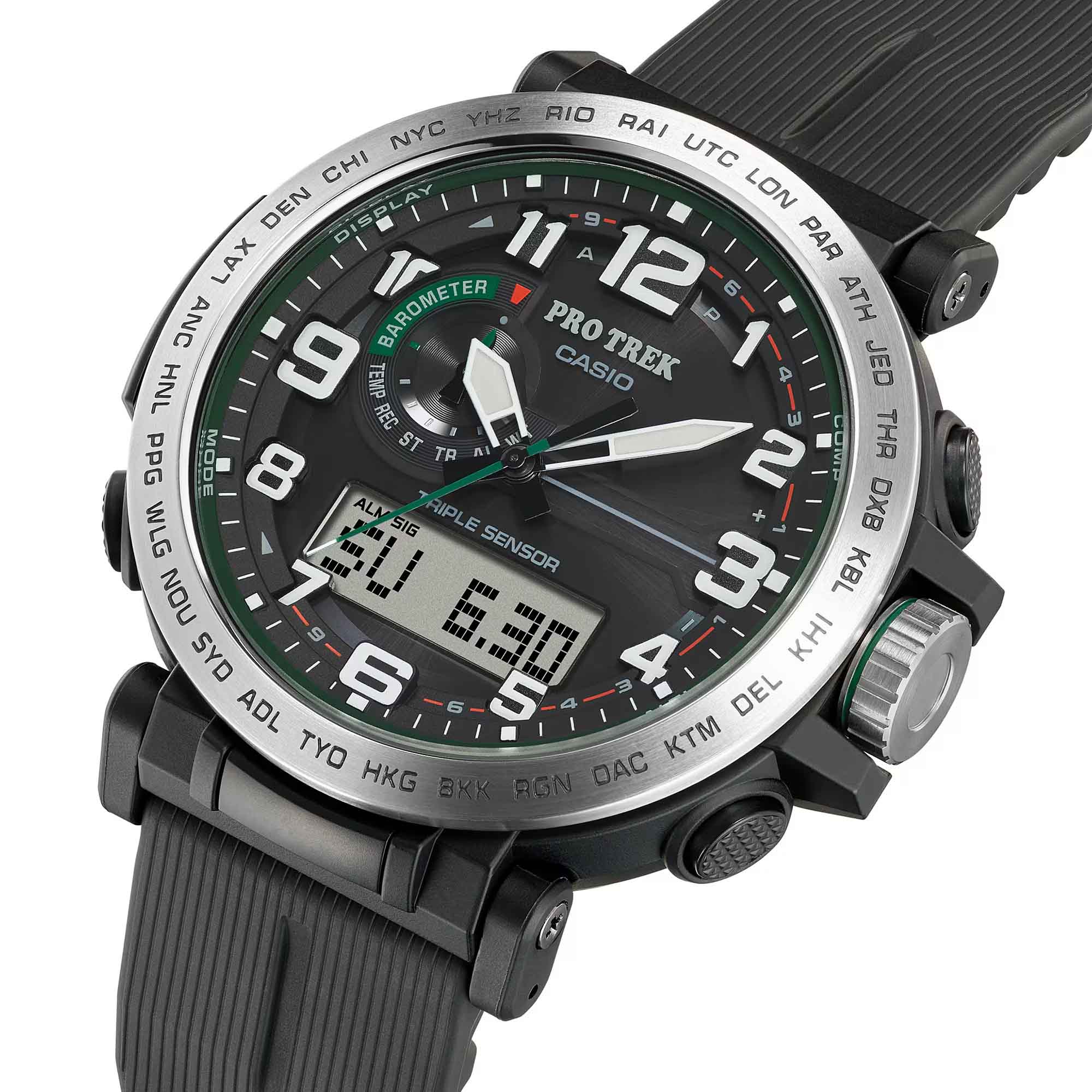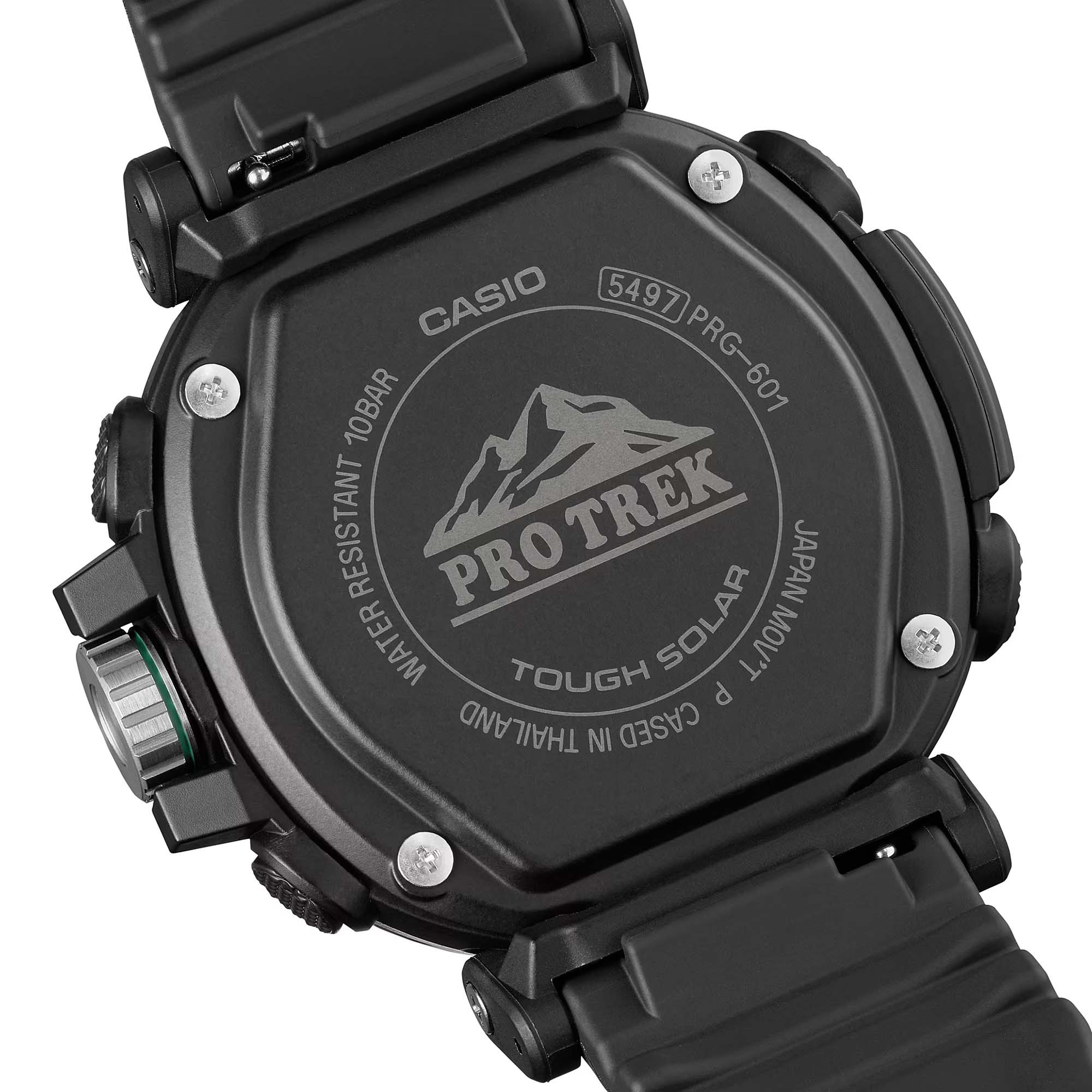 Любое ваше путешествие выйдет на новый уровень благодаря этим часам из коллекции Pro Trek. Casio Pro Trek PRG-601-1 для активного отдыха. Корпус и ремешок выполнены из биопластика, который изготавливается из возобновляемых органических ресурсов. Питание от солнечной энергии Tough SolarTough SolarТехнология основана на подзарядке аккумулятора от источника солнечного света, специальная панель улавливает солнечные лучи и преобразует их в энергию для работы часов. Достаточно пары минут нахождения на солнце для функционирования часов в течении суток. - солнечные батарейки большой мощности, индикатор заряда батареи. Функция автоматического сохранения энергии. Время работы аккумулятора без подзарядки приблизительно 7 месяцев, при включенной функции сохранения энергии приблизительно 25 месяцев. Модуль часов рассчитан на работу при низких температурах до -10°С/14°F. Двойная подcветка: циферблат и ЖК-дисплеи подсвечиваются светодиодом, благодаря наличию функции задержки, после отпускания кнопки освещение горит еще несколько секунд. Настраиваемое послесвечение 1,5 или 3сек. Цвет подсветки: белый. Необритовое покрытиеПодсветка NeobriteИспользование светонакопительных составов на основе сульфида цинка или алюмината стронция, яркий свет можно наблюдать на протяжении 6-10 часов после «зарядки» часов около источника света. обеспечивает длительное послесвечение в темноте даже после кратковременного нахождения на свету. 12-ти и 24-х часовой формат времени. СекундомерСекундомерСекундоме́р — прибор, способный измерять интервалы времени с точностью до долей секунды. с точностью показаний 1/100с и временем измерения 24ч. Сплит-хронографСплит-хронографИспользуется для измерения продолжительности нескольких временных отрезков, начинающихся одновременно, а заканчивающихся в разное время.. ТаймерТаймерОтсчитывает секунды в обратном направлении в заданном интервале времени. обратного отсчета от 1с до 1ч. Мировое времяМировое время Полезное часовое усложнение, отображающее время в основных городах и известных областях по всему миру, оно связано с часовыми поясами, удобно для путешественников и бизнесменов. – 29 городов (29 часовых поясов), всемирное координированное время (UTC). Функция включения/отключения летнего времени. Функция автоматической коррекции положения стрелок проверяет положение стрелок каждый час и корректирует его в случае необходимости. Технология Triple Sensor позволяет точно и легко определять сторону света, температуру и атмосферное давление. Термометр от -10° до +60°С с точностью 0,1°C. Барометр - измерение атмосферного давления от 260 до 1100 гПа (от 195 до 825 мм рт. ст.). Встроенный цифровой компас. Диапазон измерения от 0° до 359° с точностью 1°. Высотомер - встроенный датчик барометрического давления с возможностью вывода результатов в единицах высоты над уровнем моря (от -700 до 10000 метров). График набора высоты. Хранение до 30 записей о высотных точках рельефа местности - измеренной абсолютной высоты, даты и времени. Система Smart Access с помощью электронной заводной головки обеспечивает простой и удобный доступ ко всем важным функциям часов. Нажатие или поворот заводной головки позволяет переключаться между различными режимами и активировать будильникБудильникБуди́льник — часы, в заданный момент времени подающие звуковой, световой и/или в редких случаях другой 